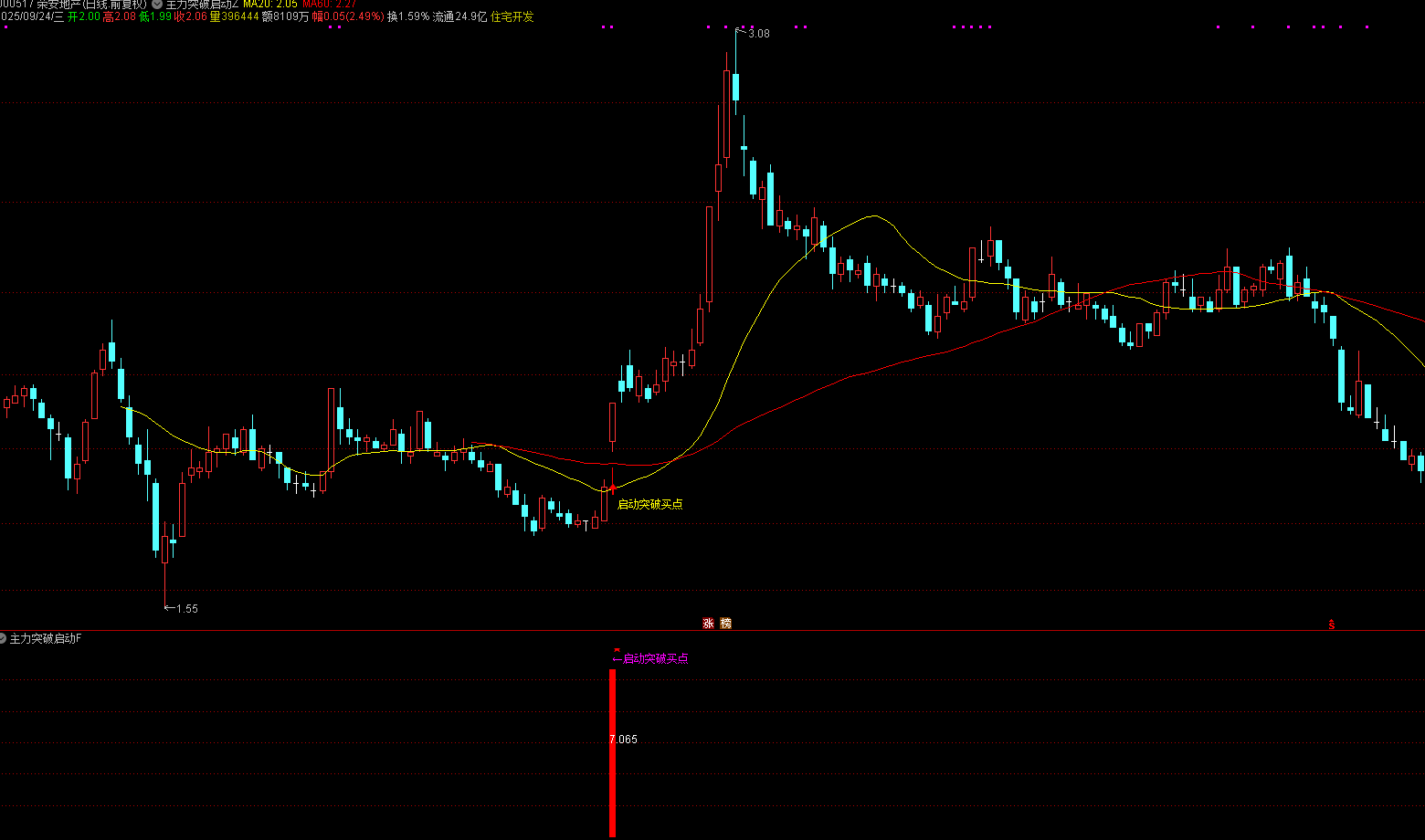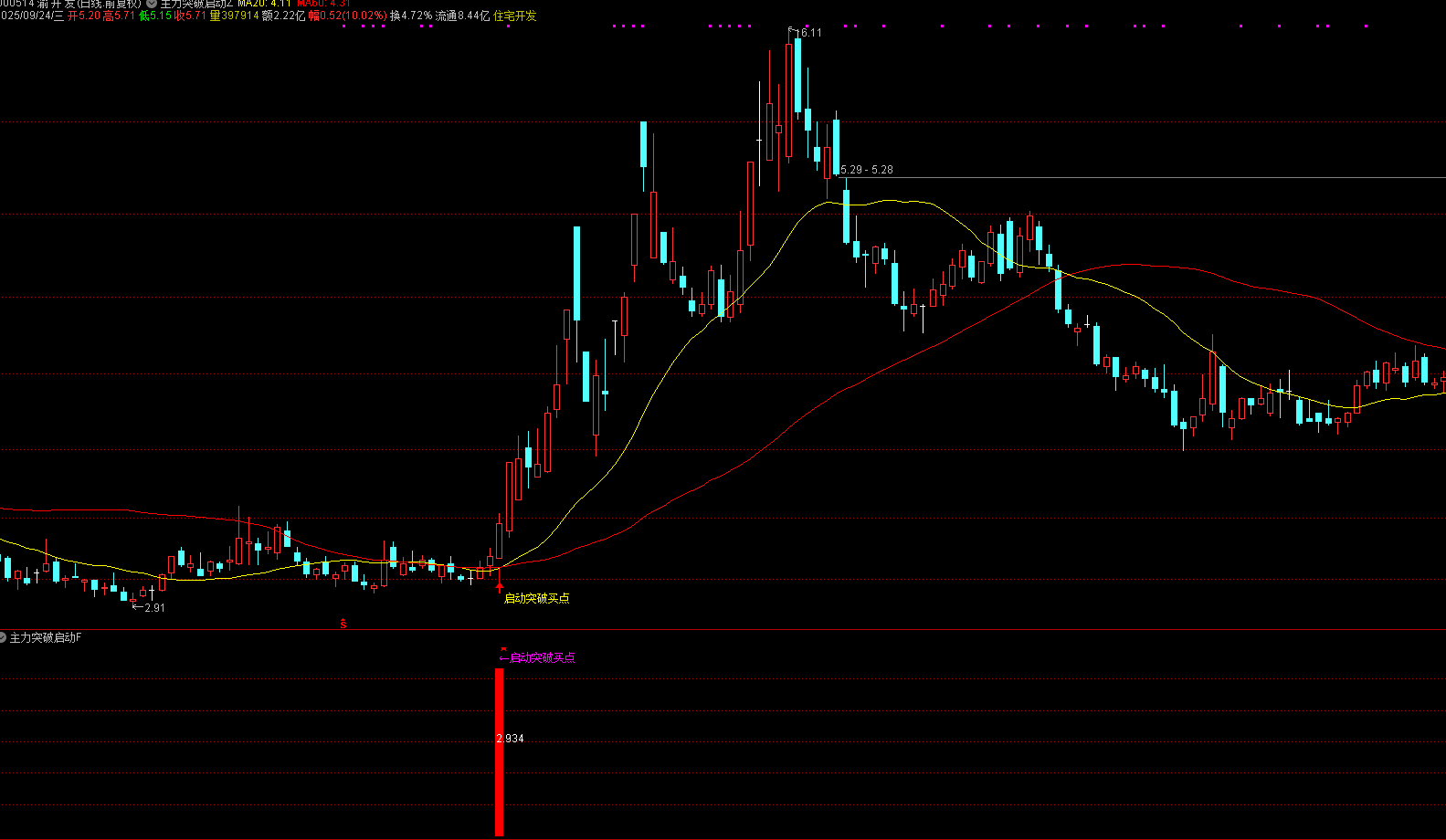 主图信号:当出现红色标记和 “启动突破买点” 文字时,说明趋势和价格都达标了,旁边的小箭头会精准指向信号位置;