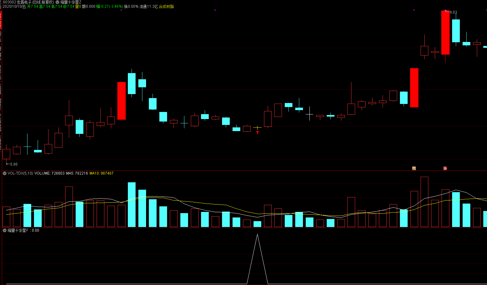 主图将标记黄色十字星,并在其下方显示红色五角星。该红色五角星位置即为选股指标所捕捉的标的信号。