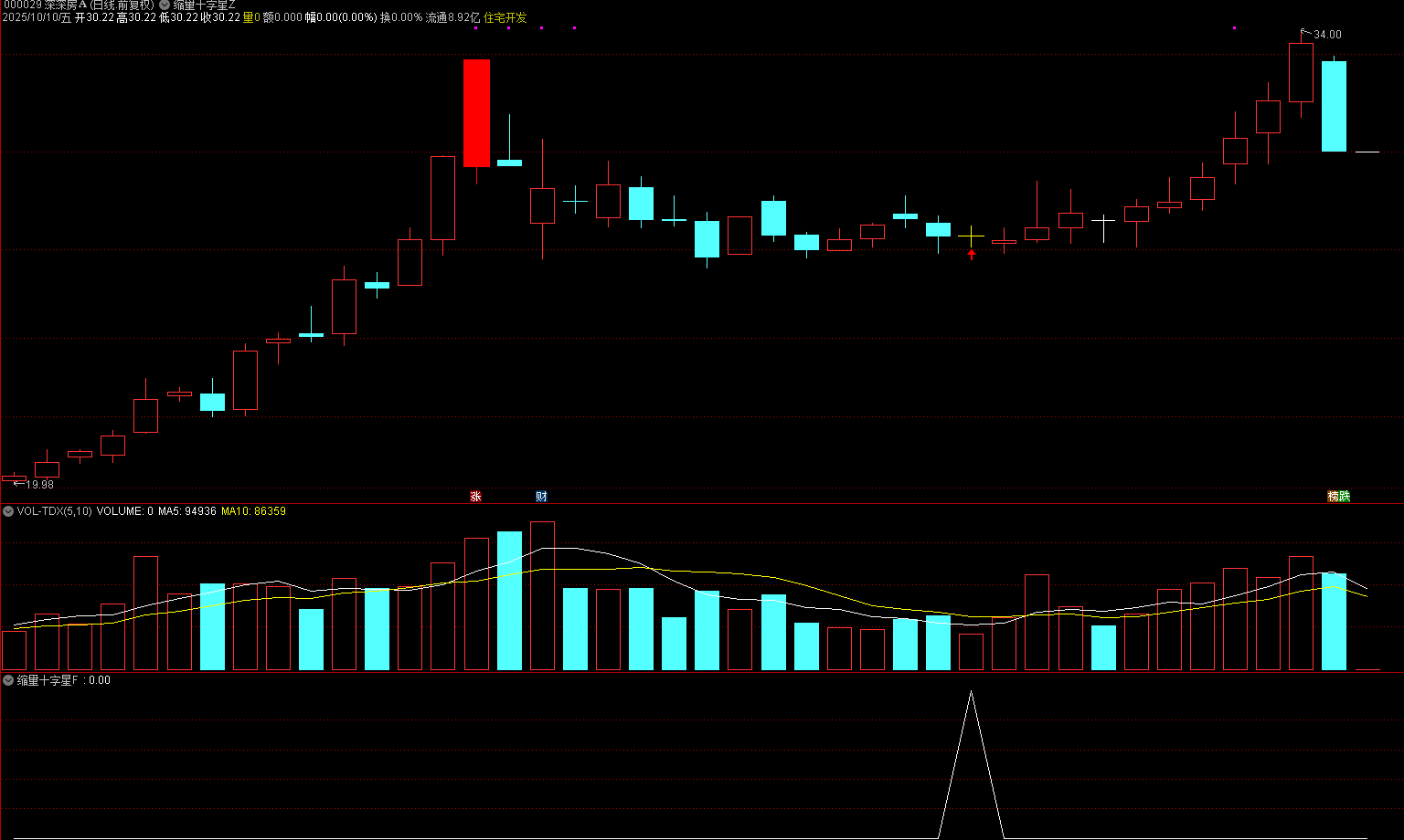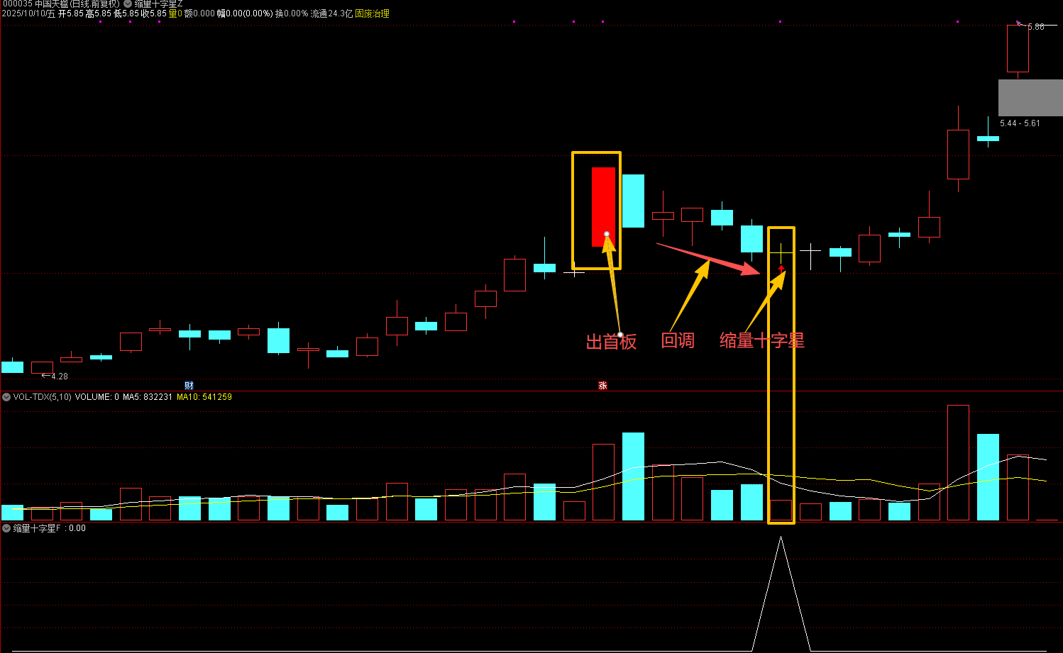 本指标用于识别近5日内出现非一字板、非T字板的实体首板,随后股价持续回调、重心下移,且量能整体呈现缩量趋势,直至出现首板以来最小量能的十字星信号。