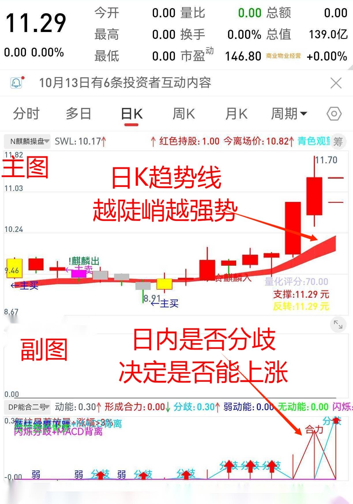 用于日内看资金是否形成合力,可以印证上述指标选出个股是否强势,“分歧”的个股不能做,当日基本是下跌的;红线非分歧或合力的,基本是大涨的,属于辅助指标。