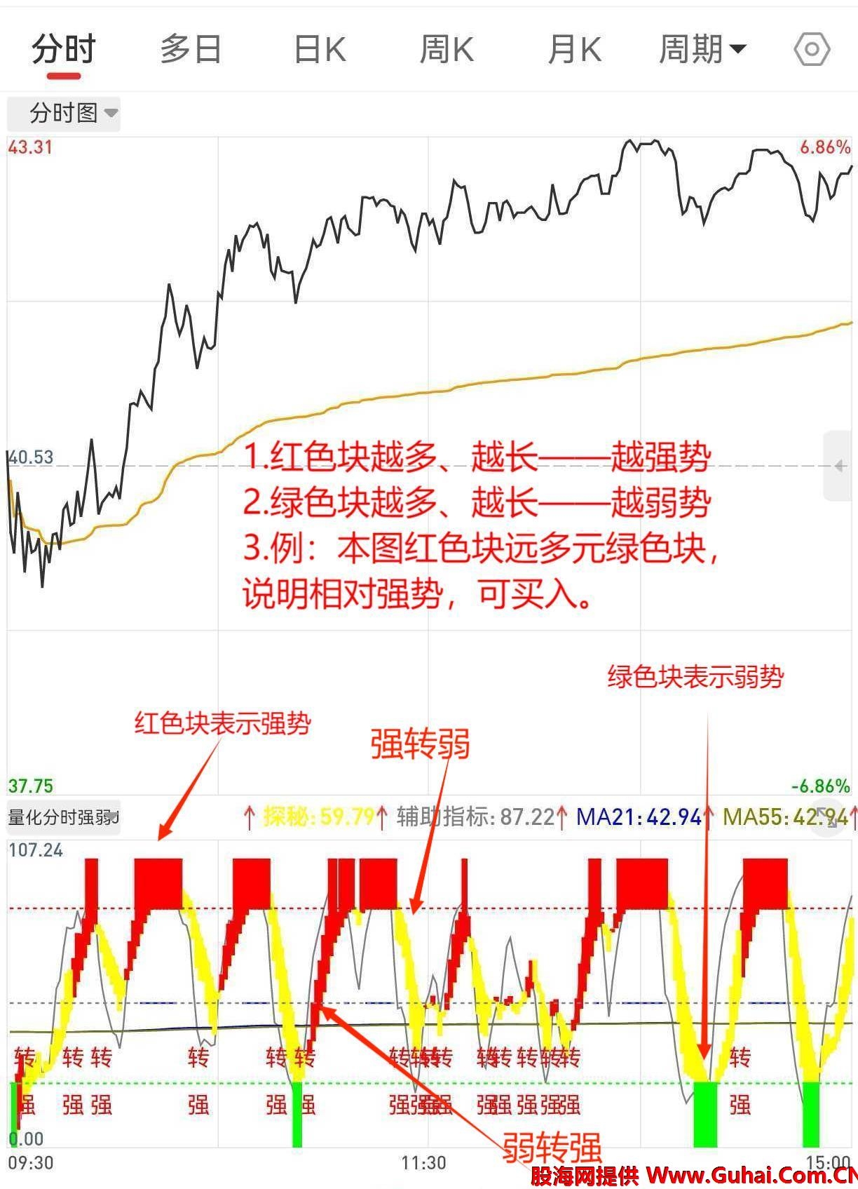 3.强势红快与弱势绿块的黄条表示“强转弱”;