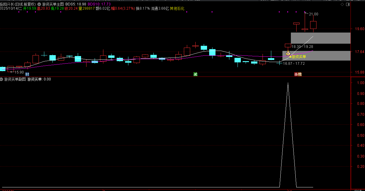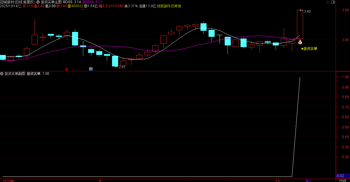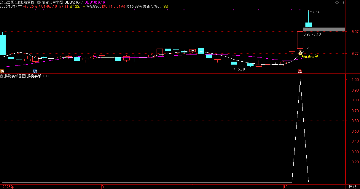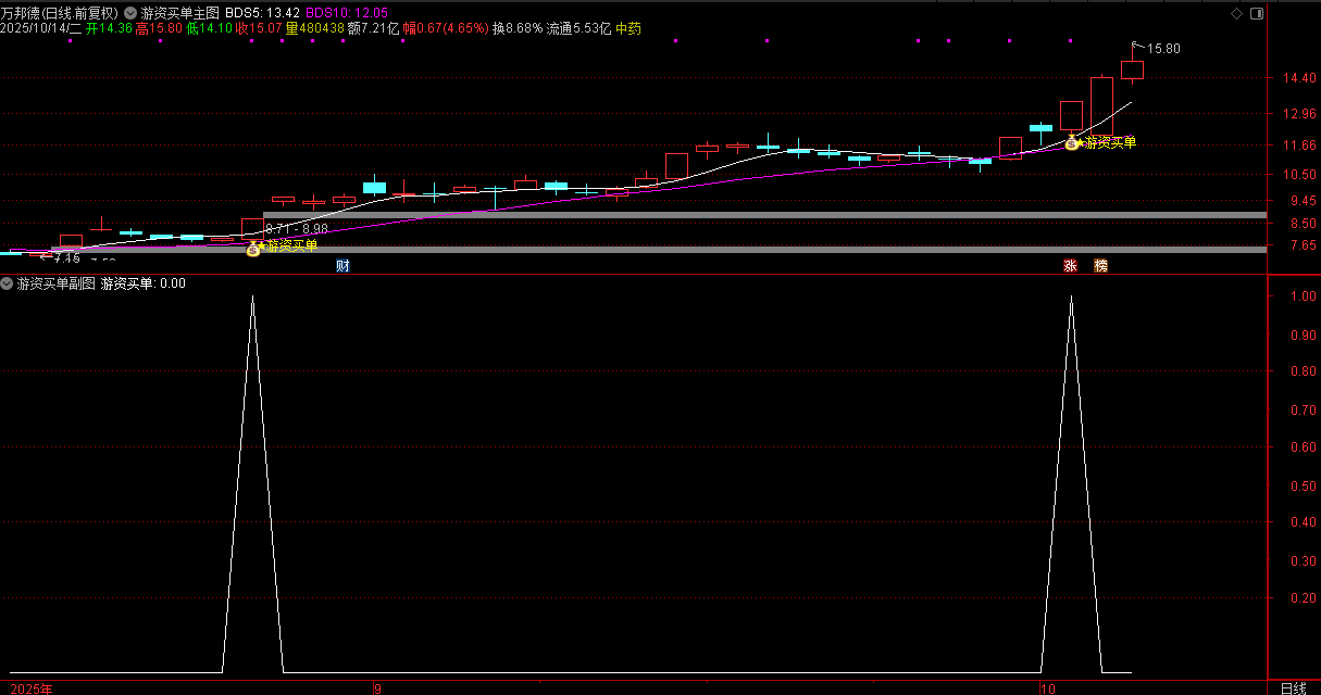 (通达信日进斗金之游资买单指标主要用于识别短期强势股。核心逻辑是通过价格波动率、成交量变)