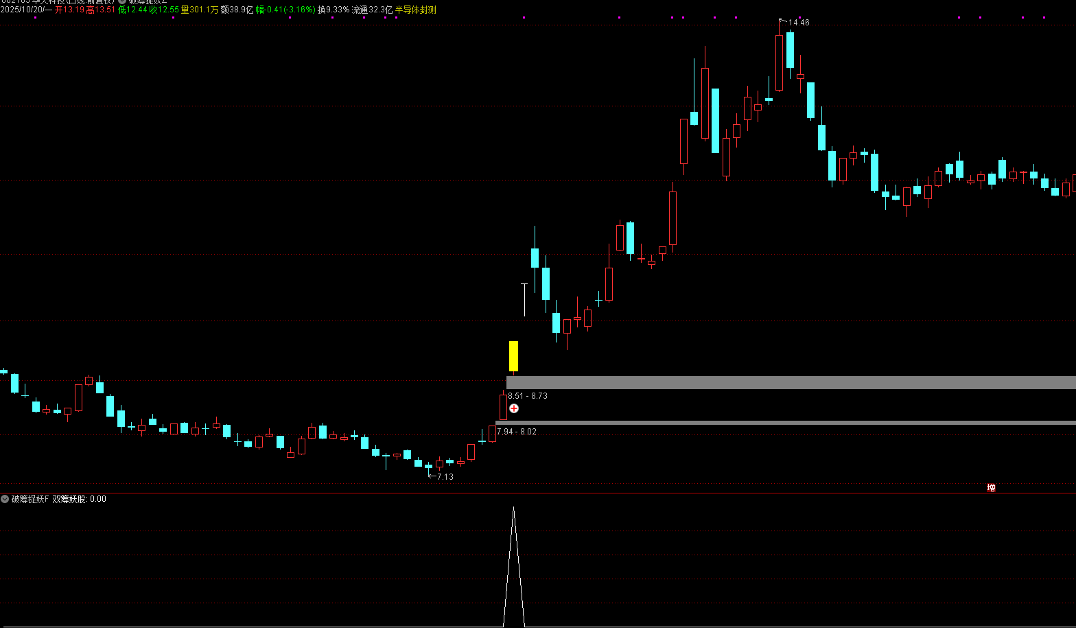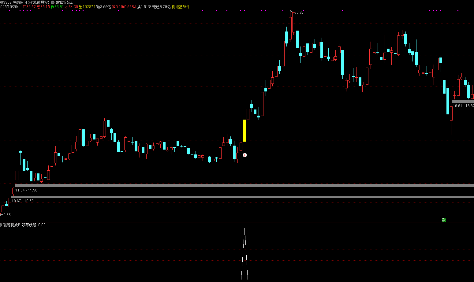 当指标出现"双筹妖股"图标及文字提示时,表明个股同时满足: