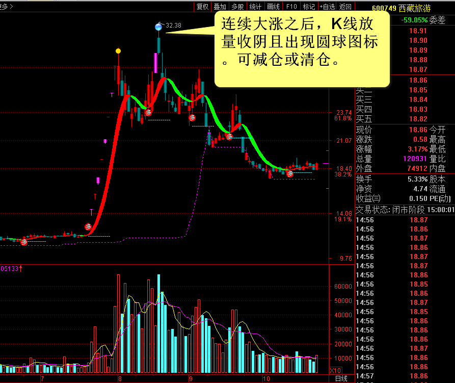 4,在相对高位出现了篮色圆球图标或黃色圆点,且放大量,可减仓。不放巨量且只是小阴线,可忽略这样的 信号,不用管它,只有放大量且在相对高点时可减仓或清仓。但并非每个股都有这样信号提示,有的有,有的票没有。只有符合条件的才出这样图标。