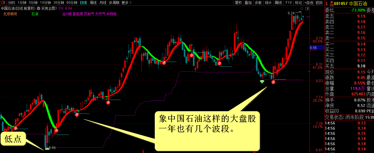 3,洋红色虚线相当于一条低点线,当股价回落到虚线附近,若出多字,可做为一个波段入场点。
