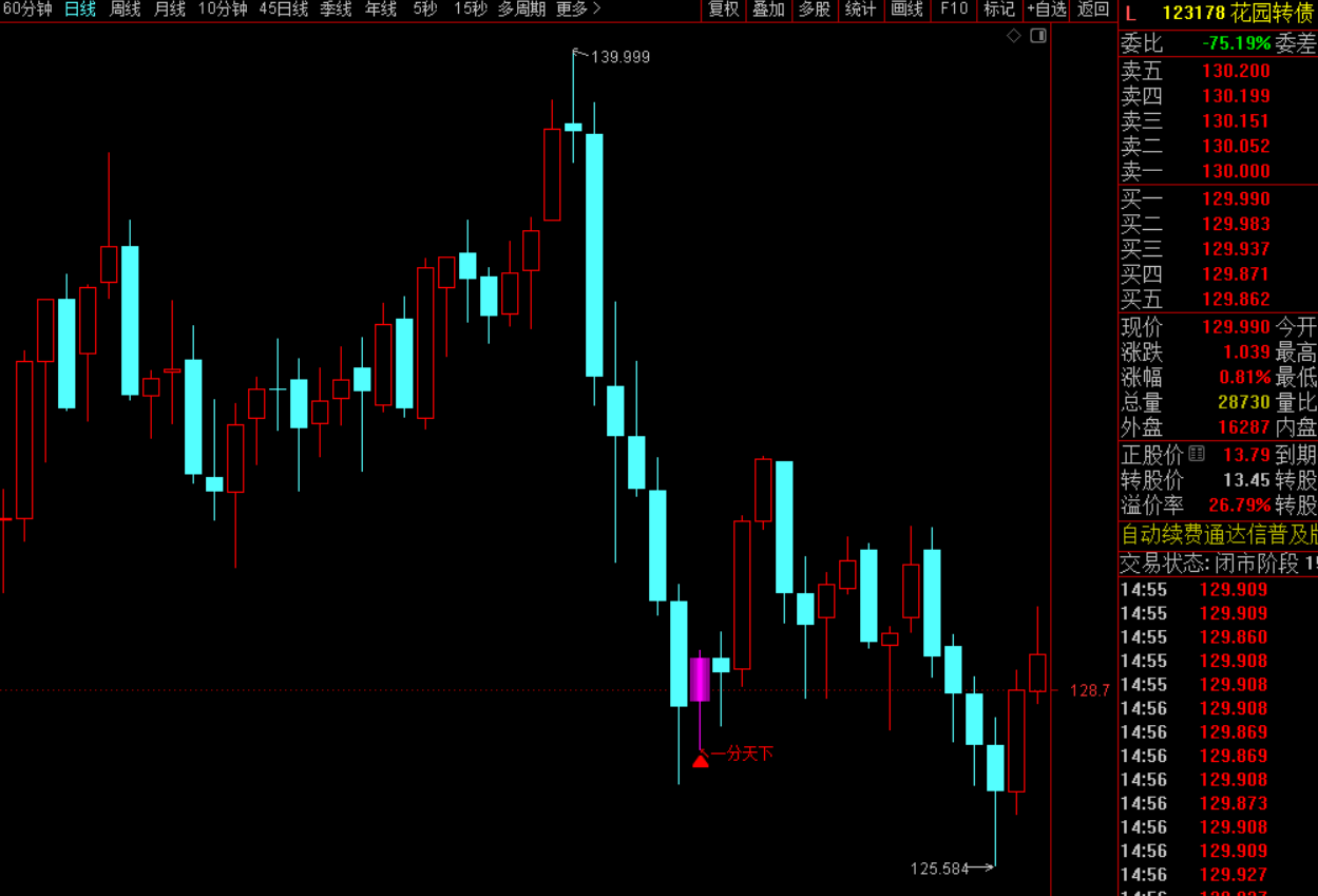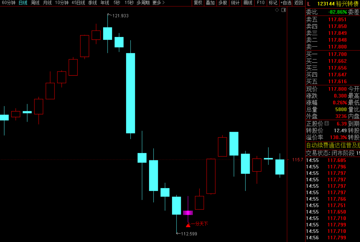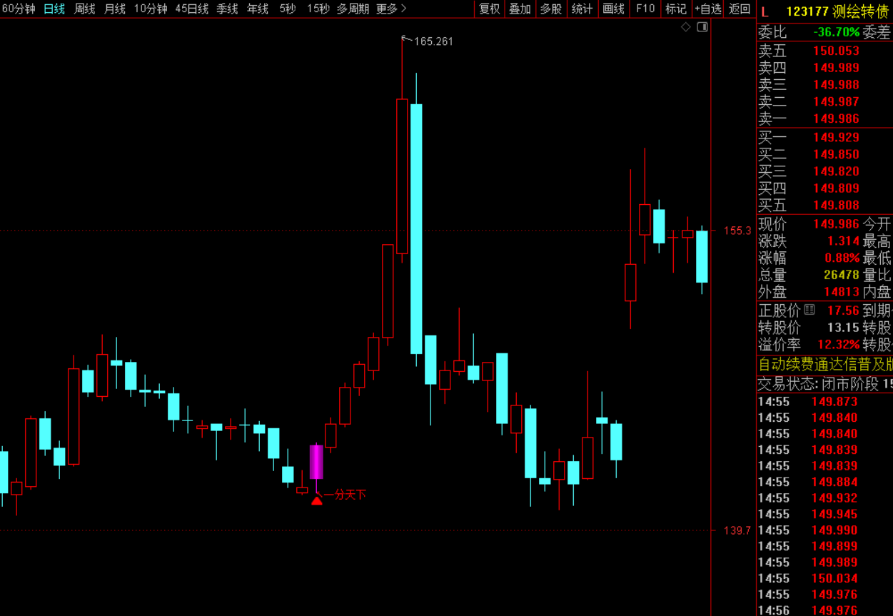 化用“卧龙先生”诸葛亮,未出茅庐而知天下三分。意指指标能像卧龙一样,在转债“沉睡”(处于低位)时便发现其价值,静候腾飞。此指标为主图指标,分为一分天下/二分天下/三分天下三种信号。一分天下信号较多,二分天下居中,三分天下极少。他们的唯一区别就是选出的数量不同,因为有些人喜欢选出的数量多些,有些人喜欢少些,为了平衡各个需要,所以我弄了三种情况,根据自己实际情况,用自己喜欢的选债指标即可。
