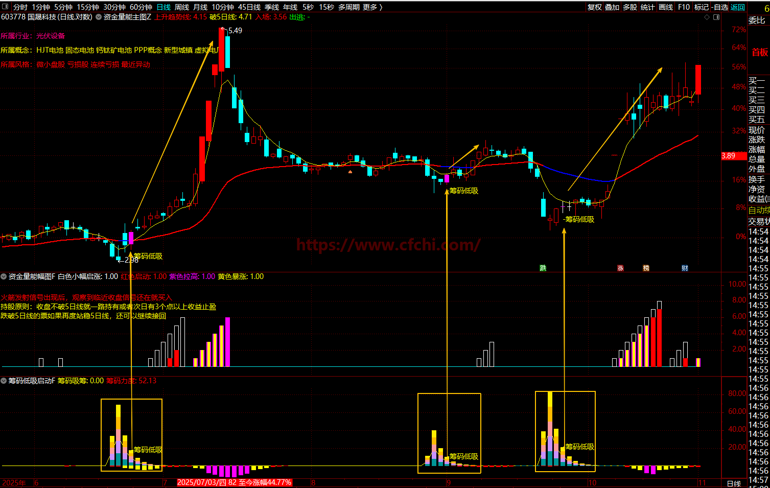 1、资金启动信号:突破55/144/233日三重均线、金叉、量比>1.2且涨幅>1%、短期量能达标(白色/红色)