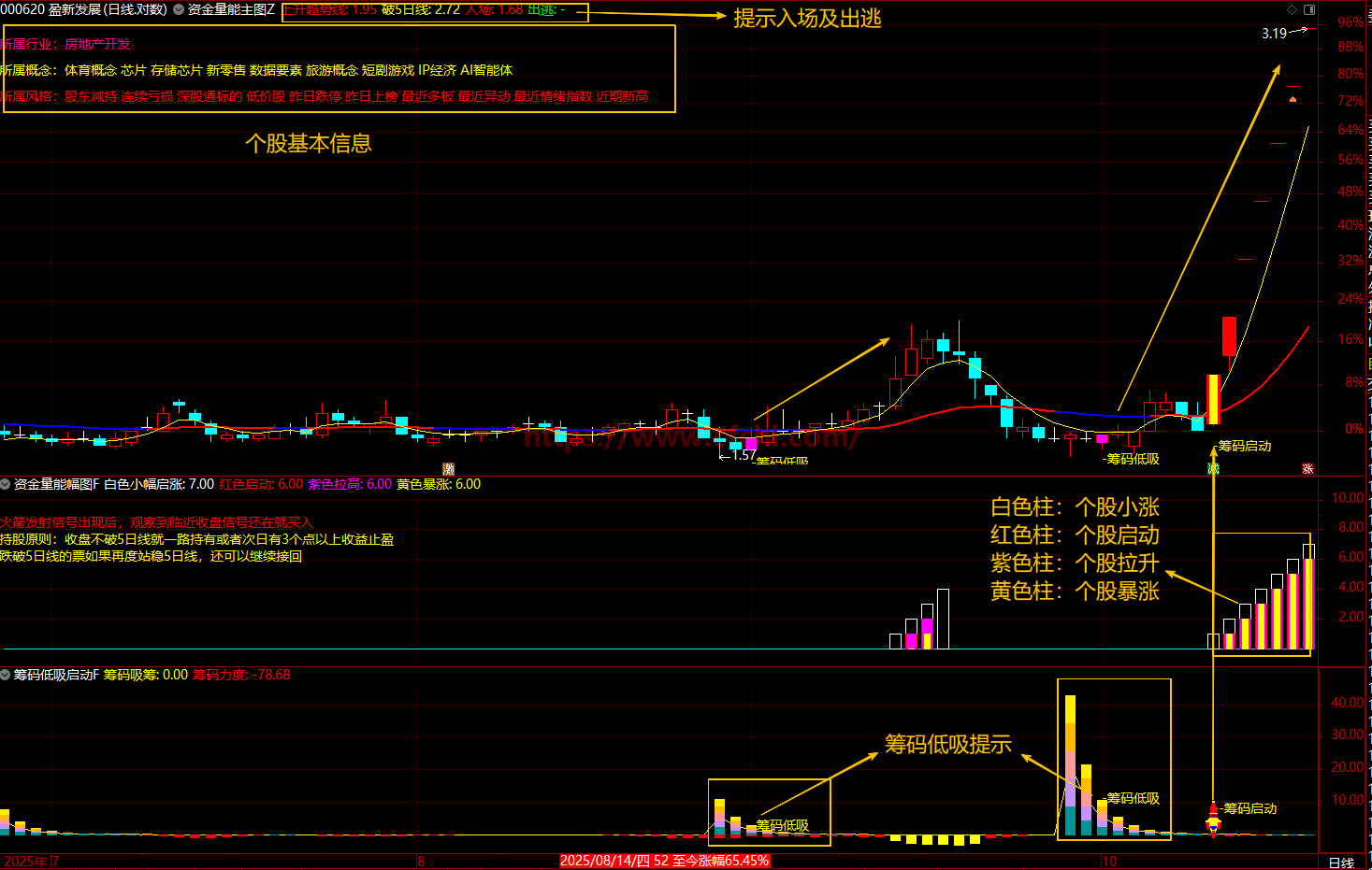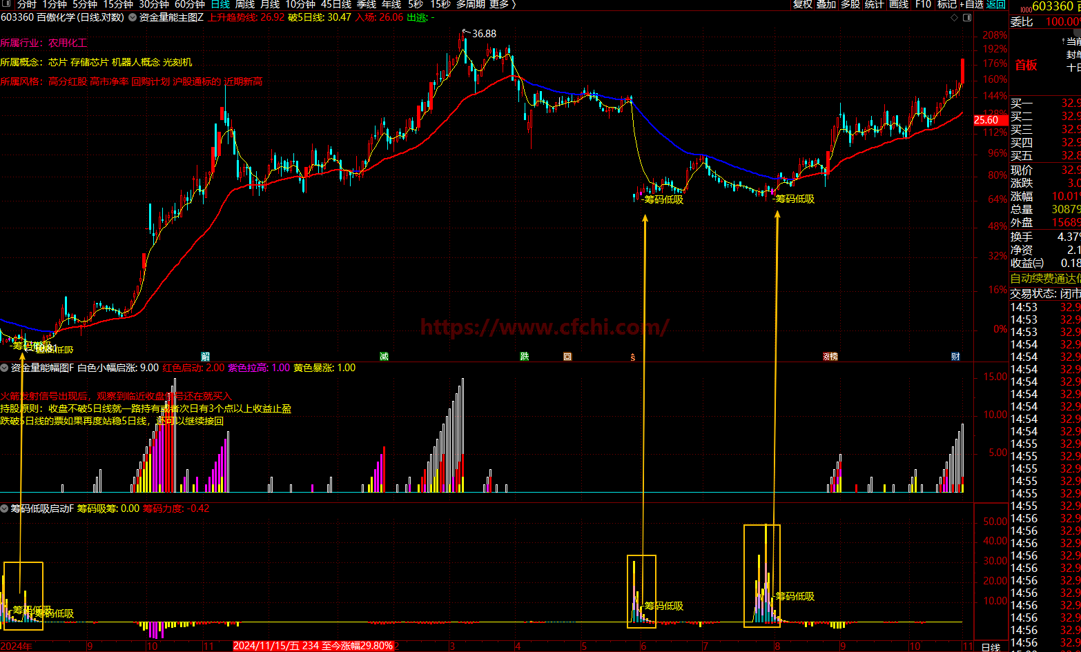这是一个综合性的资金筹码监控系统,通过量价、筹码、资金三个维度精准捕捉低吸及拉升等信号:
