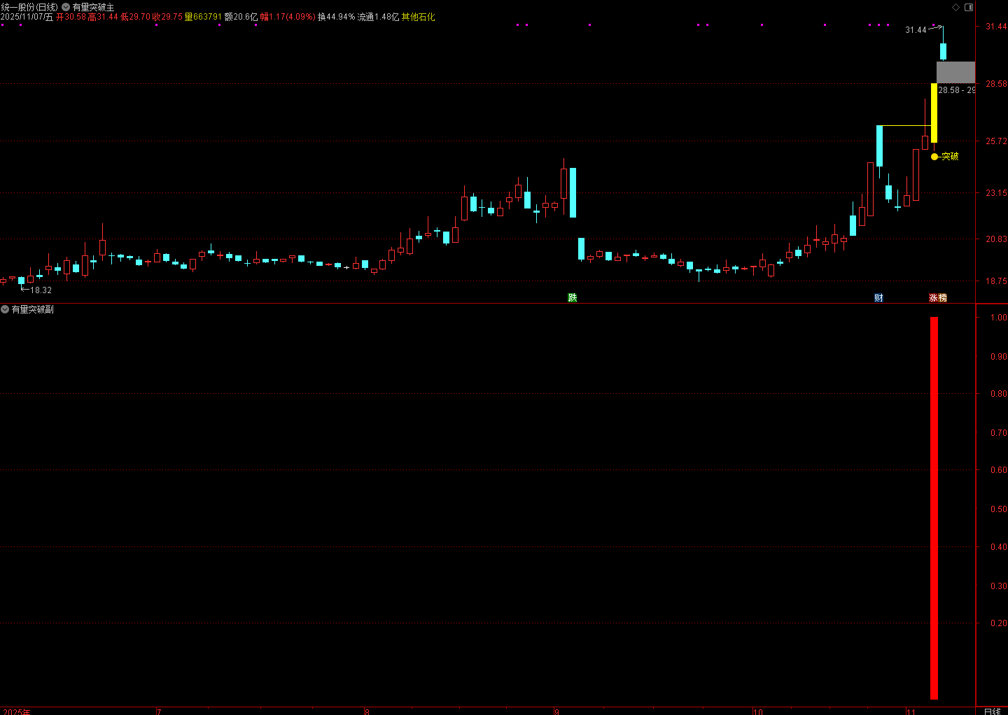 (通达信〖有量突破〗缩量盘整放量突破前高策略 主副图/选股)