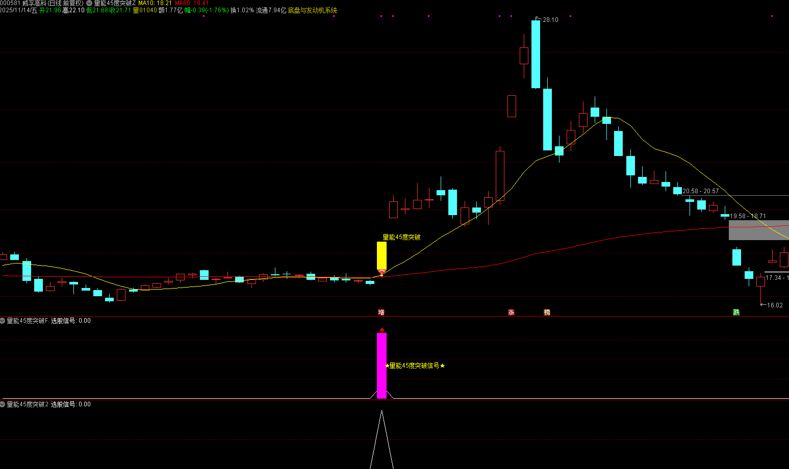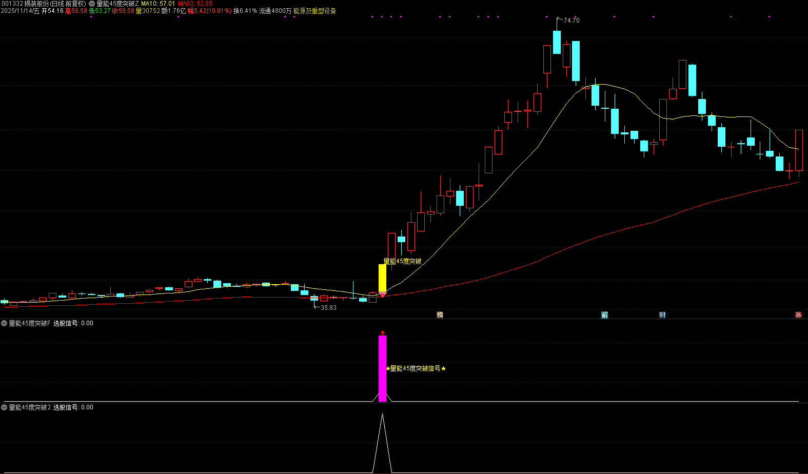 (通达信 量能45度突破 主副图选股 短期趋势加速型共振指标)