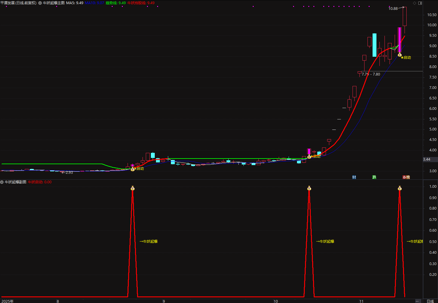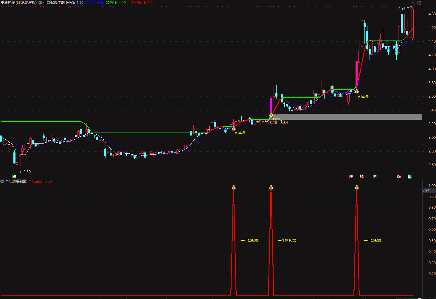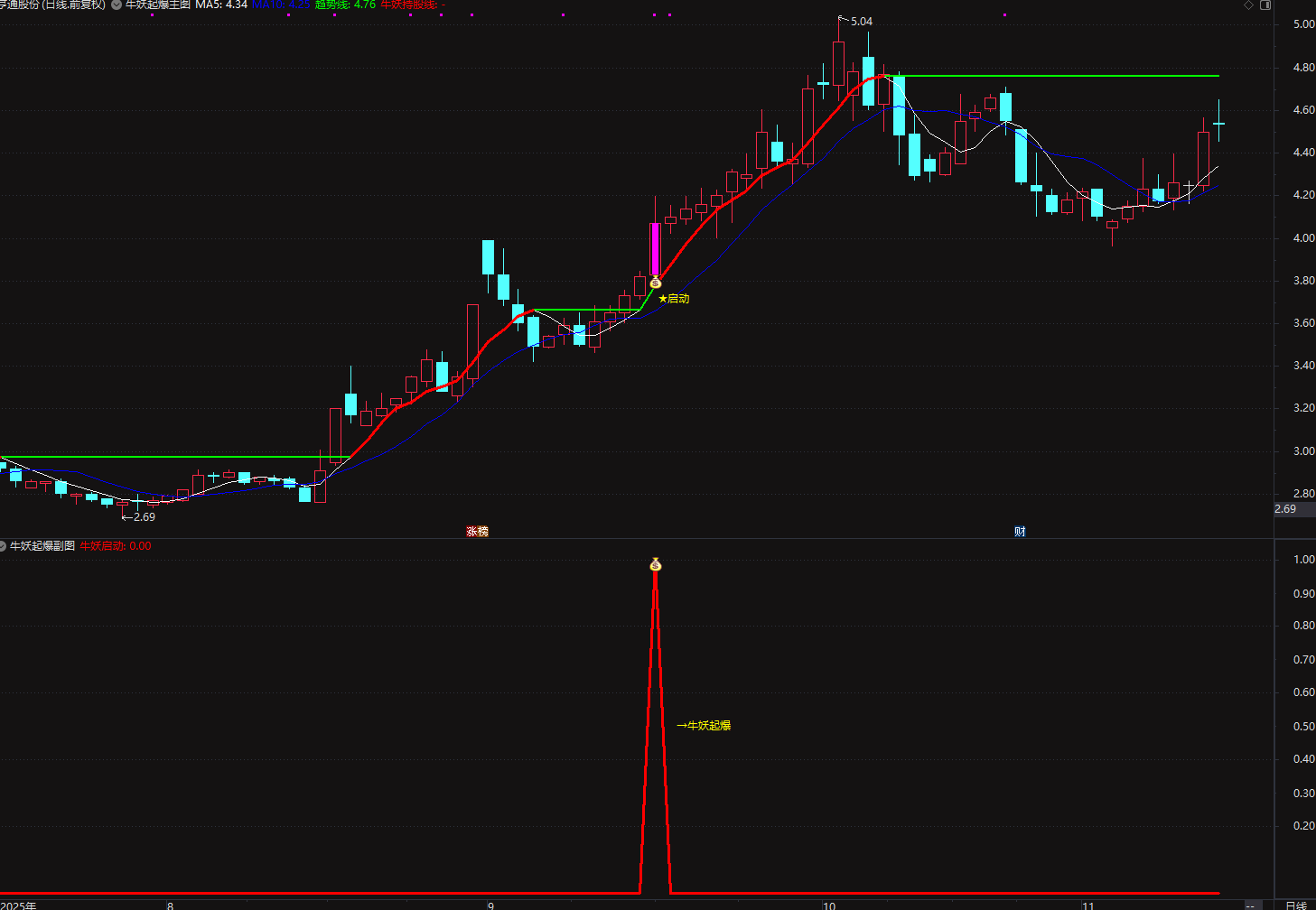 (通达信〖牛妖起爆〗主副图/选股 识别股票价格突破长期趋势线启动信号 参考使用 )