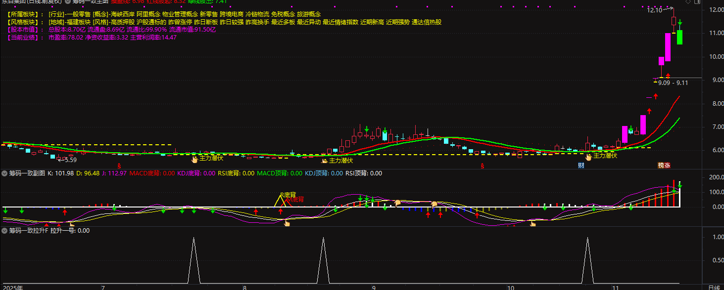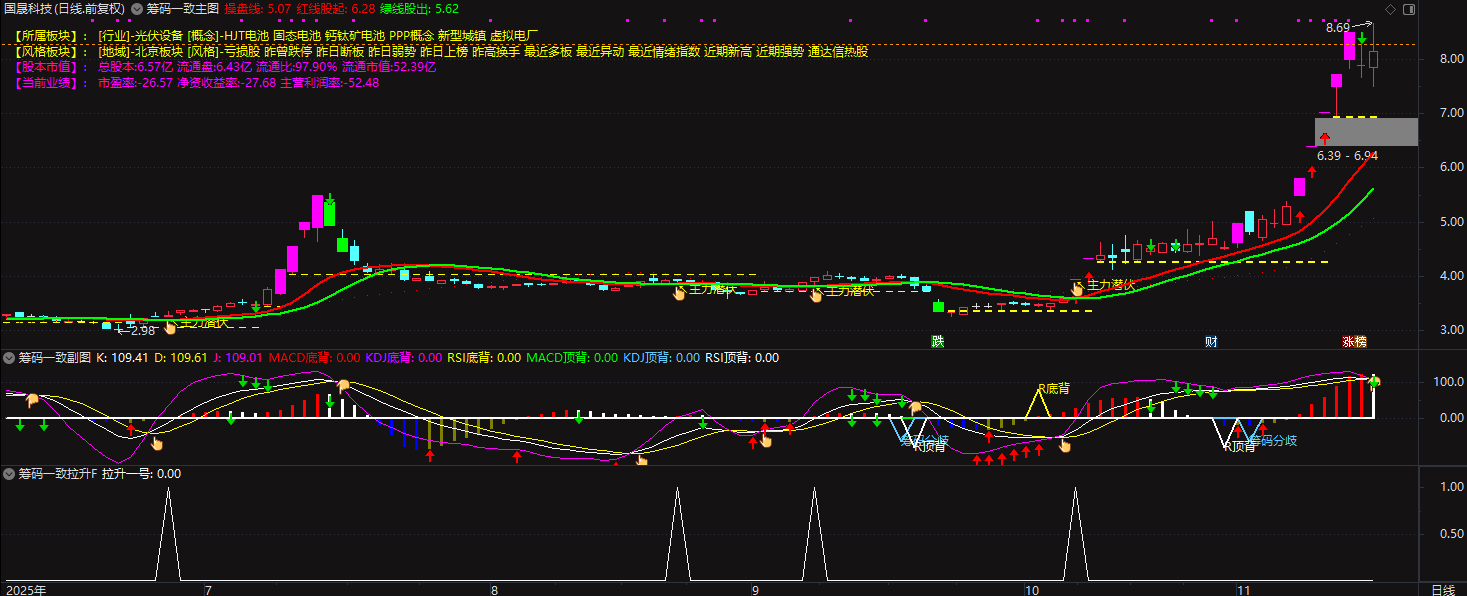 拉升特征:股价上涨时伴随 “T2B” 放量(V/REF (VOL,1)≥3),且 “红柱(短线动能)” 与 “绿柱(中线动能)” 同步向上,“红线股起”(210 日加权均线)向上支撑股价,无明显 “主力撤”(V4≤0)信号;
