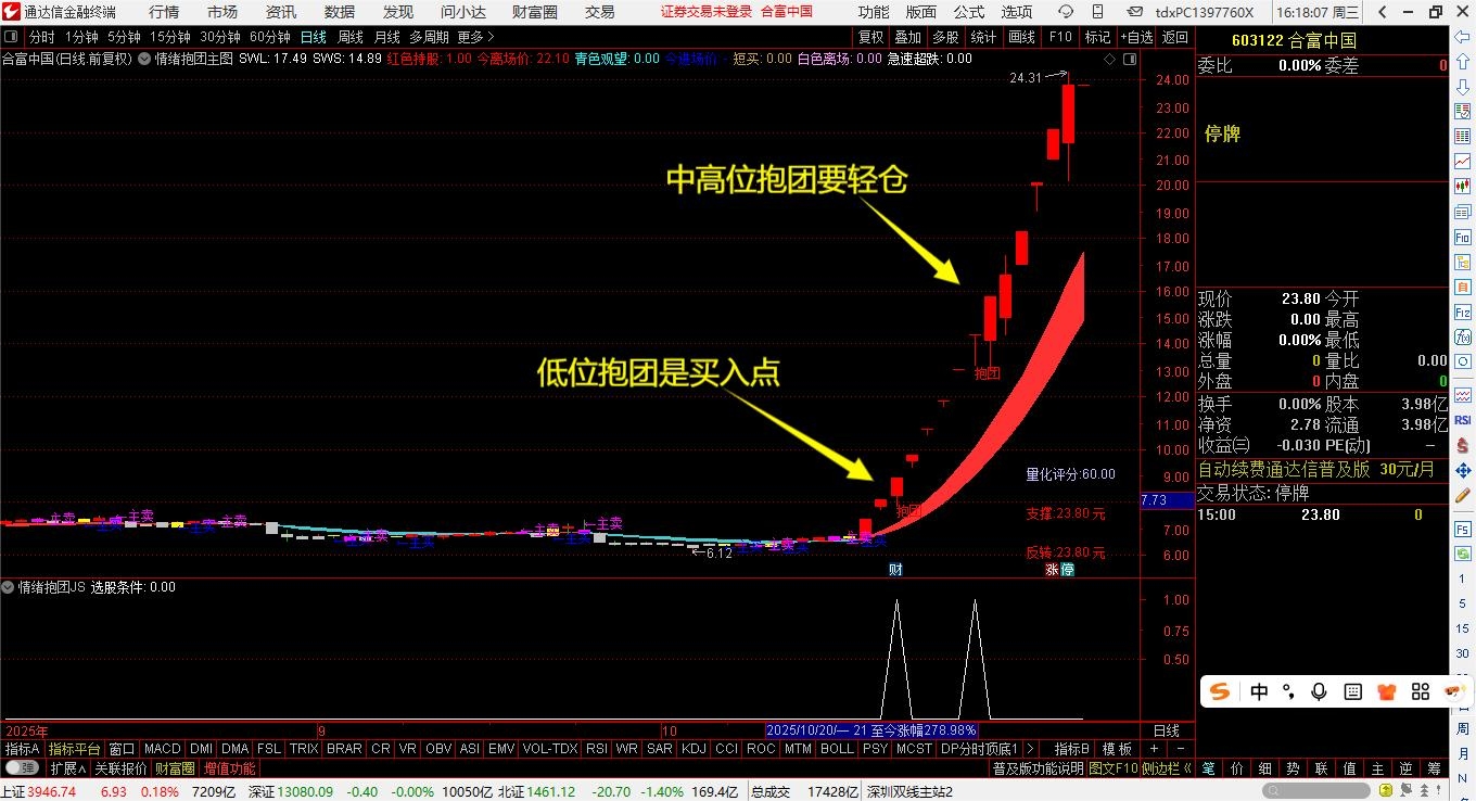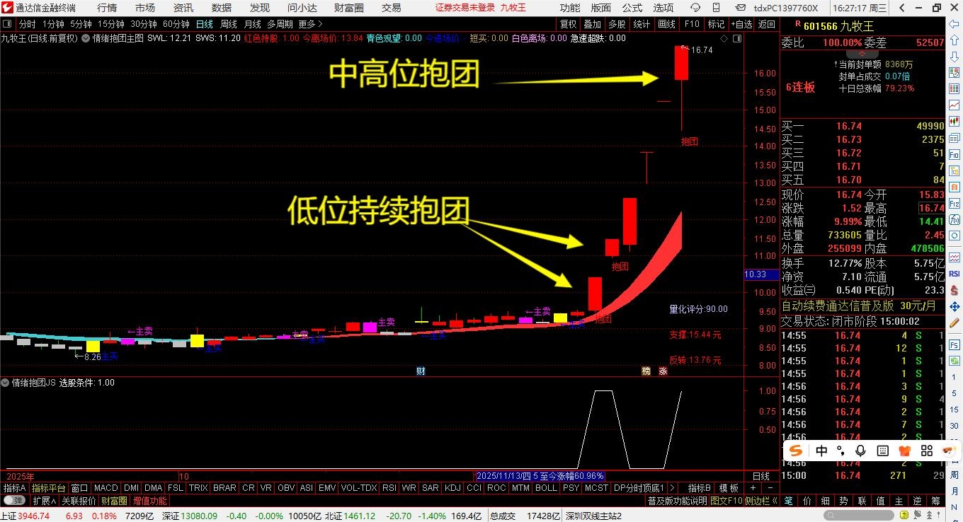 本策略聚焦“情绪+资金+技术”三重共振,专攻涨停基因明确、主力深度介入的抱团强势股,尤其是在市场震荡、下跌中表现优秀。个股达到条件时,在主图中有明确的“抱团”字样,低位抱团是最佳买入点,中位抱团要轻仓,一般行情还会持续,高位抱团(5板以上)不要进;是实现利润翻倍不可或缺智能工具。