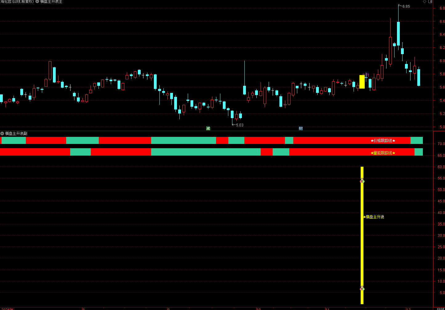辅助柱线变色:65-68或70-73区间柱线由红转绿,且当日成交量放大(说明资金离场导致趋势弱化)