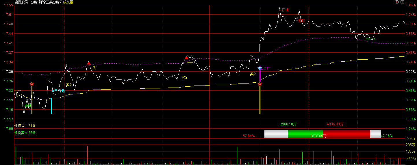 通达信缠论三买分时主图指标,该公式是一款A 股分时图专用的短线交易辅助工具,核心逻辑是通过 “资金流向监测 + 量价突破验证 + 多维度均线共振”,实时捕捉日内强势股的启动、拉升及涨停信号,同时提供买卖点标注和资金占比可视化,适合短线投资者盘中快速决策。