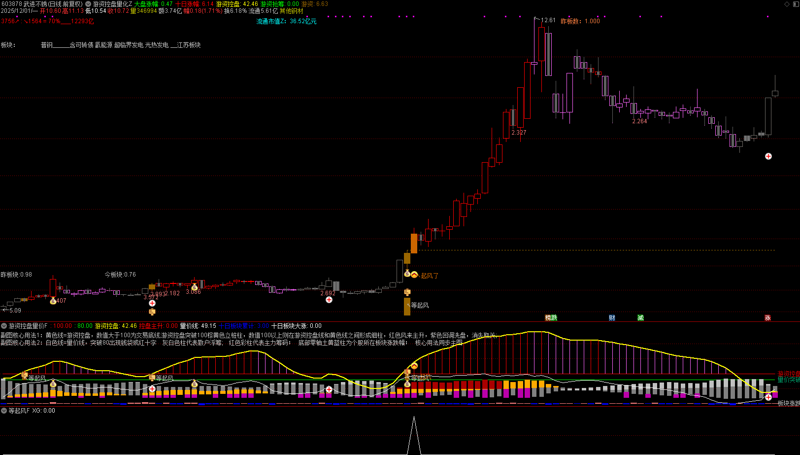 紫色细柱:控盘度 >100 但未创新高(洗盘阶段)。