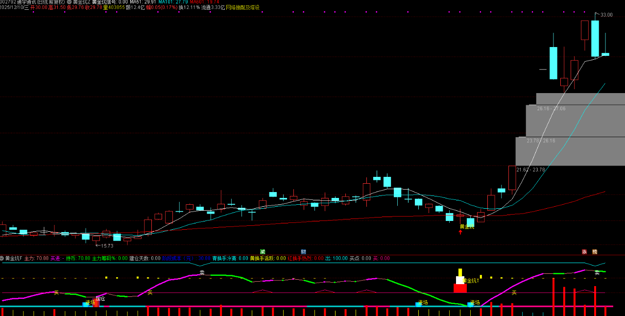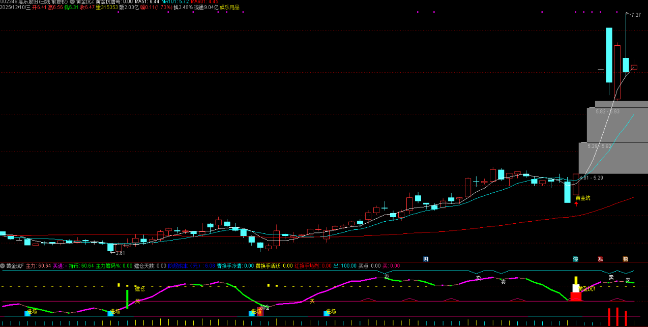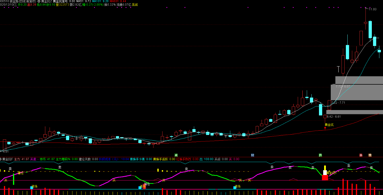 该指标结合改良版 KDJ 动能拐点与中期均线多头趋势双重逻辑,筛选出短期具备反弹动能、中期处于上升趋势的 “黄金坑” 买入信号,既规避纯震荡行情的假信号,又保证标的处于中期上升趋势中,适用于中线偏短的交易策略选股。