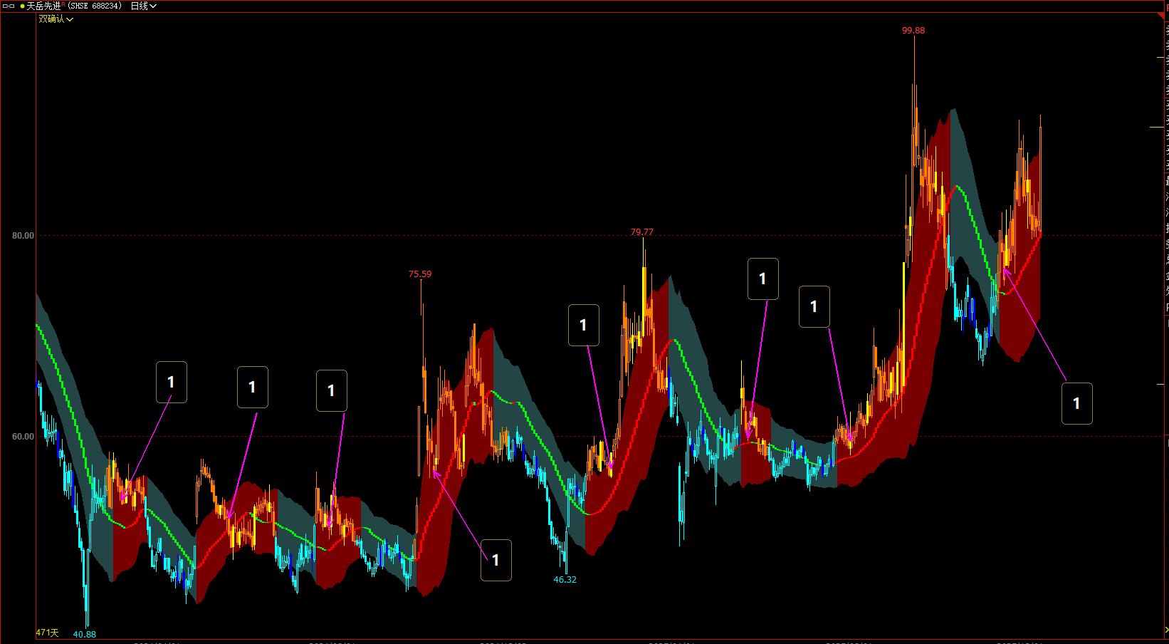 今天,我给大家介绍一款交易模型,它有两个部分组成,变色的轨道和变色的K线,两种交易方法的共振,故名双确认交易系统。交易的逻辑就不介绍了比较复炸,我把它总结成了两个面,多或者空,轨道红色多绿色空,K线橙色多蓝色空,这样一来,你再看看K线的图形是不是一下子就清晰起来。具体操作方式如下: