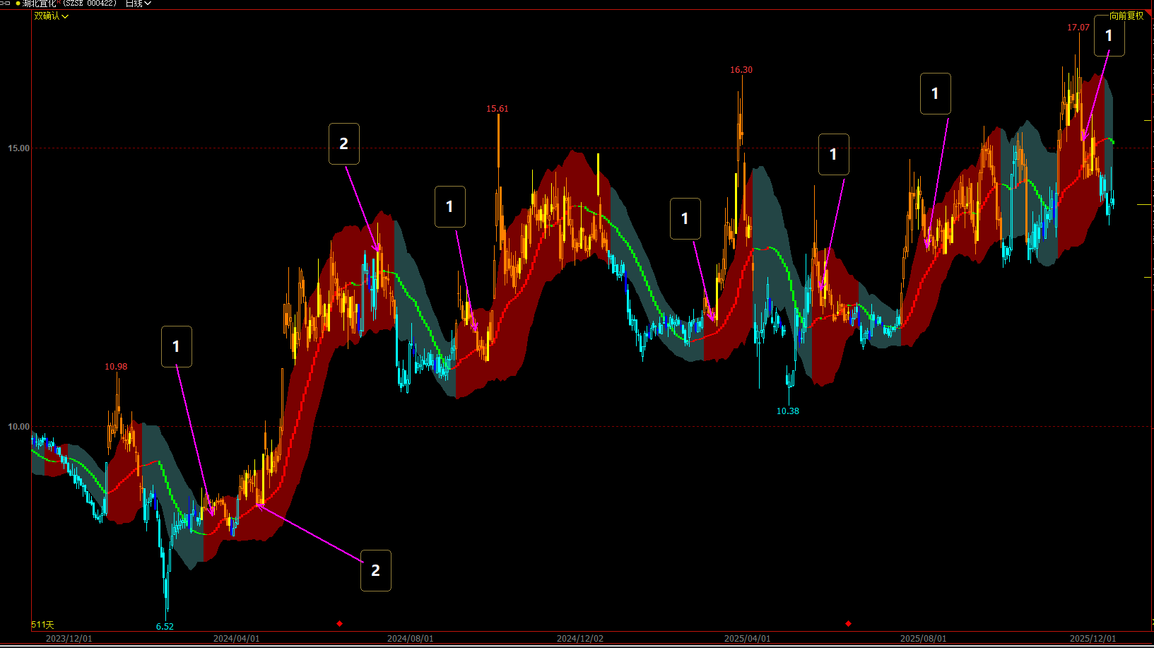 通过上面的交易规则,一般的小白也可以做到轻松交易。我随便找了几幅K线图,标明了1、2号的买点,周期跨度都比较长,是为了更好展现这个模型对K线图形的良好的掌控能力,在行情不利我们的操作时,我们如何做到撤退离场的时机,做到小赚或小亏,在对的情况下,又是可以拿到不错的利润,这就是一些高手常说的,赔就要赔小的,赚就要赚大的,做到进退有度。好了,这个模型就讲这么多,售后服务提供免费的指导工作。(注:本指标编写适用文华6的软件使用)