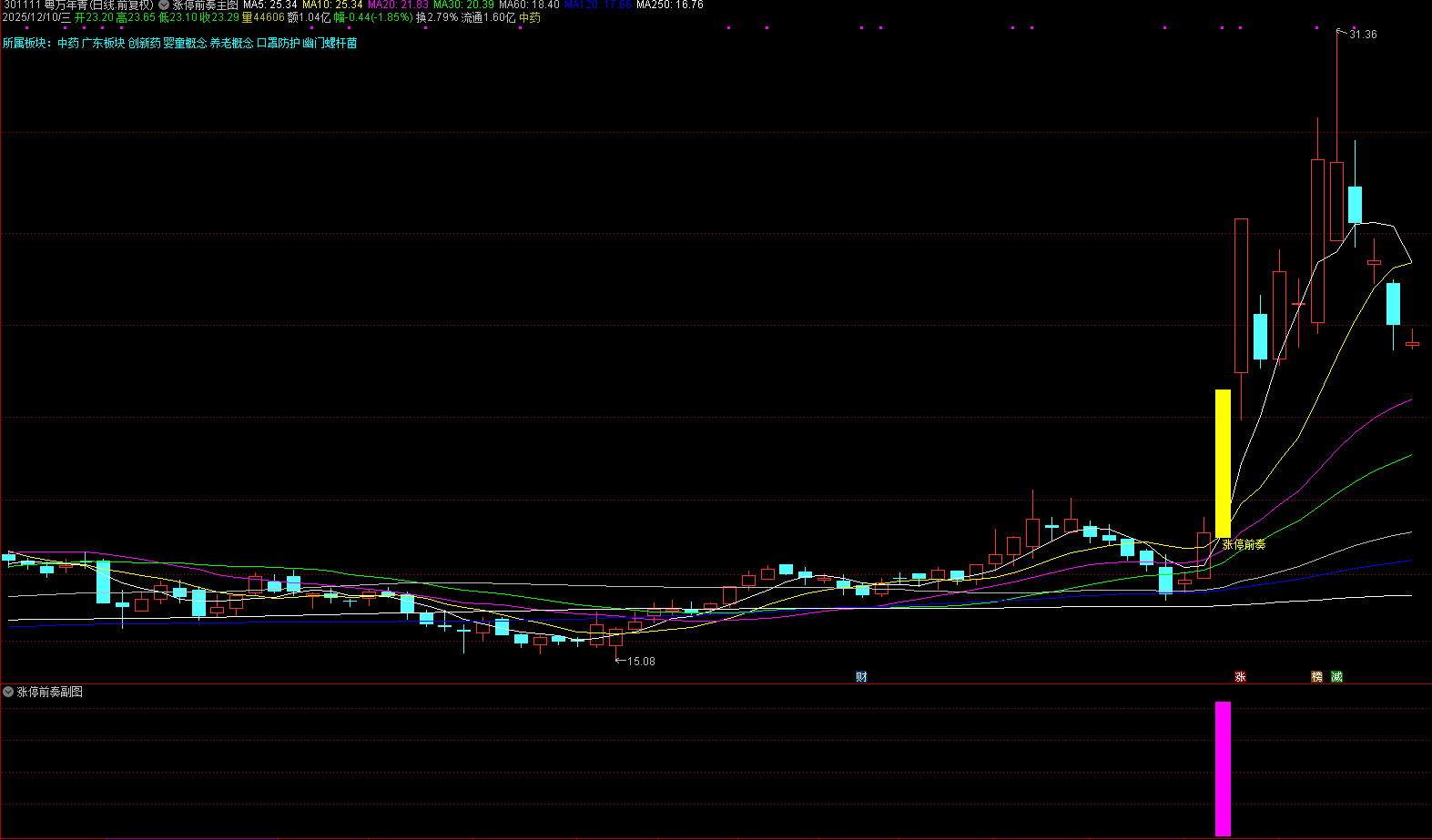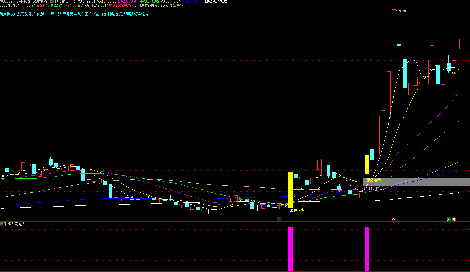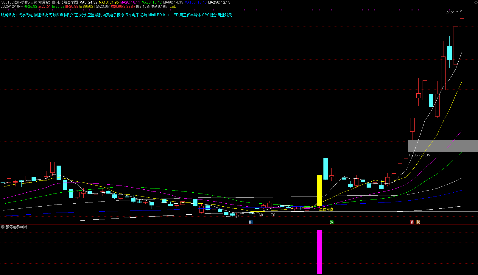 最终当VAR12与VAR16同时触发时,输出“涨停前奏”信号,提示价格在量价齐升与指标加速上行共振下,可能即将冲击涨停。该策略侧重于捕捉强势启动点,兼顾趋势与动量过滤。该指标重点抓强势冲击涨停股,避免追高,设好止损,风险第一!