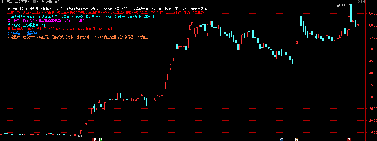 指标源码主要用于在股票分析软件中固定位置展示个股的多维度基本面与市场信息,包括所属概念、主营业务、实际控制人、公司行业地位、选股逻辑、业绩情况、机构评级及风险提示等关键内容。其核心功能是将外部数据以文字形式直观呈现在图表界面上,便于投资者快速掌握标的综合情况,辅助判断是否符合自身投资策略。操作上无需复杂信号,重在信息整合与可视化,适合用于初筛或复盘时参考。