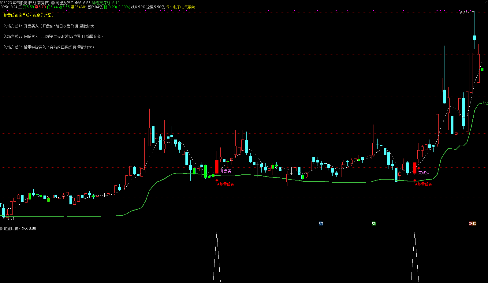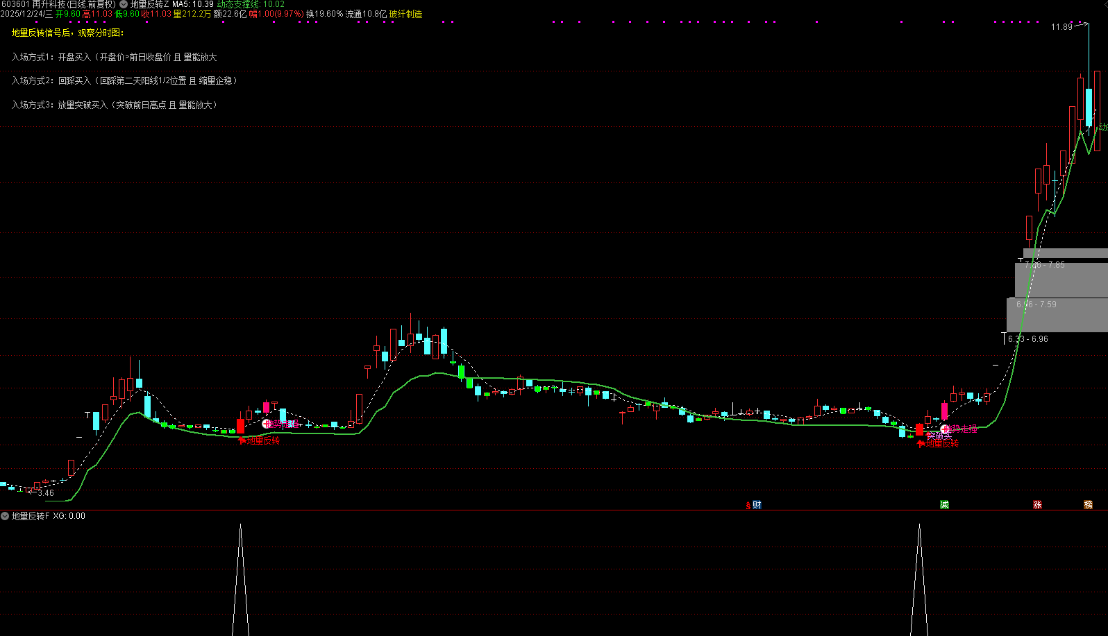 地量反转:地量次日股价反超地量日开盘价,量能放大1.5倍,回踩动态支撑(误差≤2%)且收盘站稳,叠加多条件共振确认反转,避免假底。