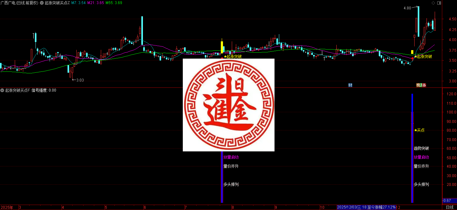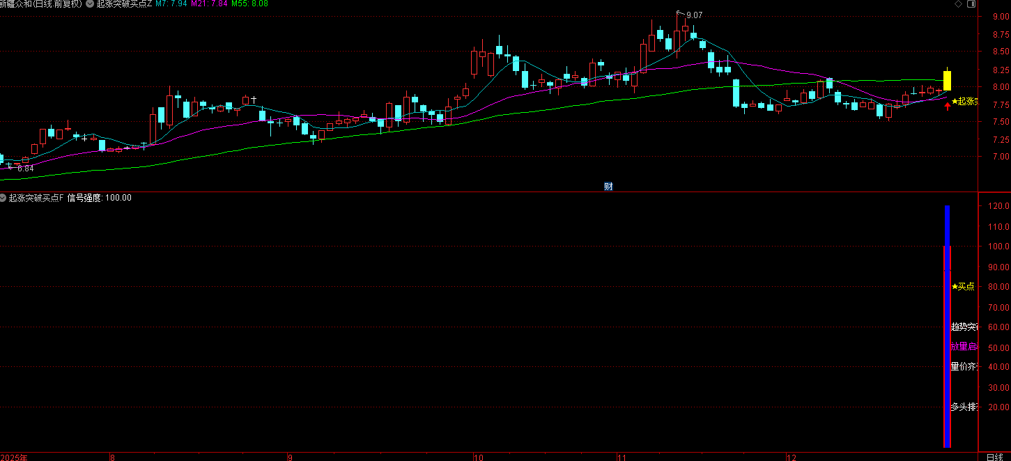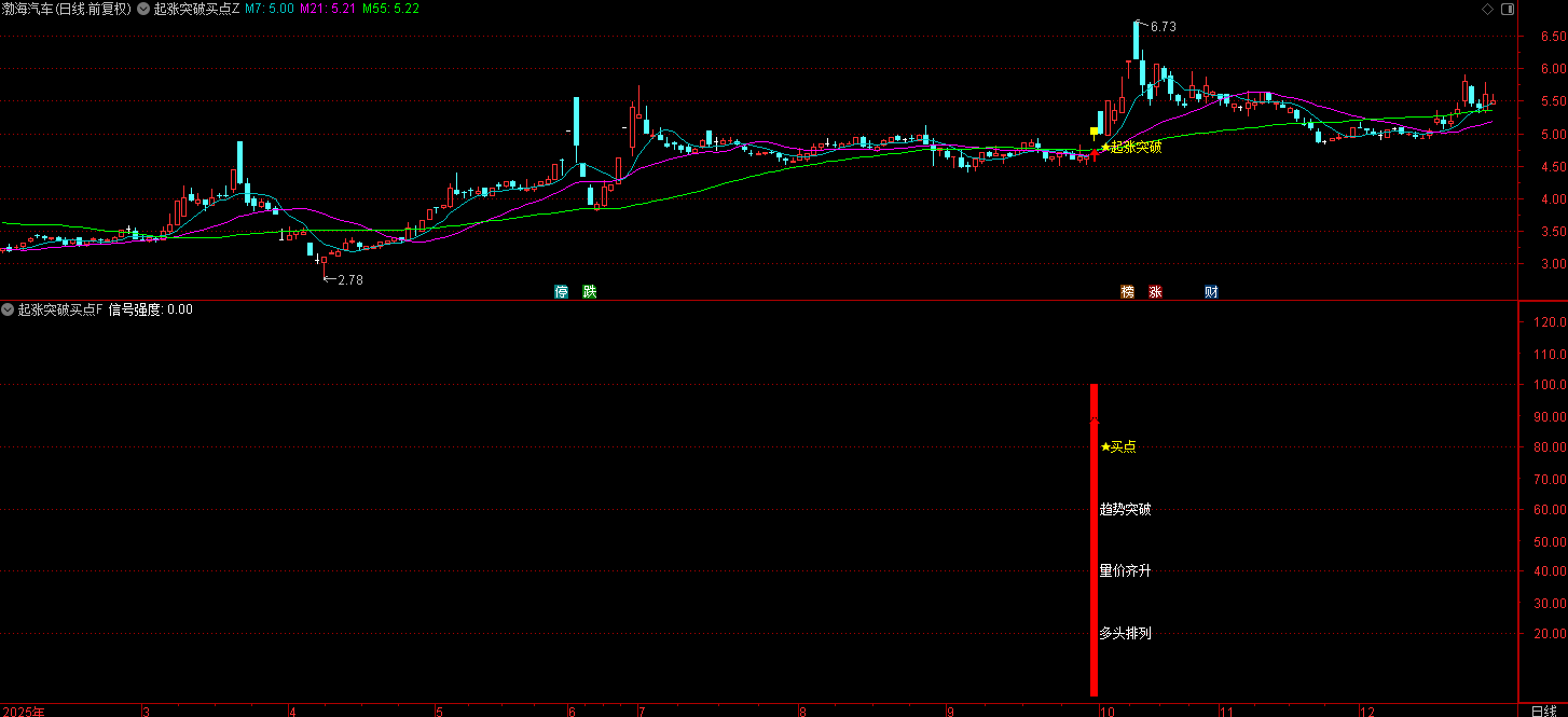 指标的核心目标是识别股价在经历整理或筑底后,符合多重技术条件的强势启动点。