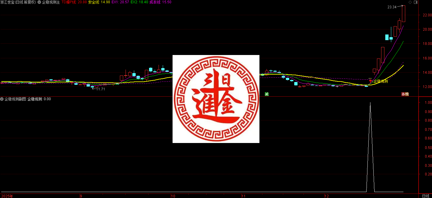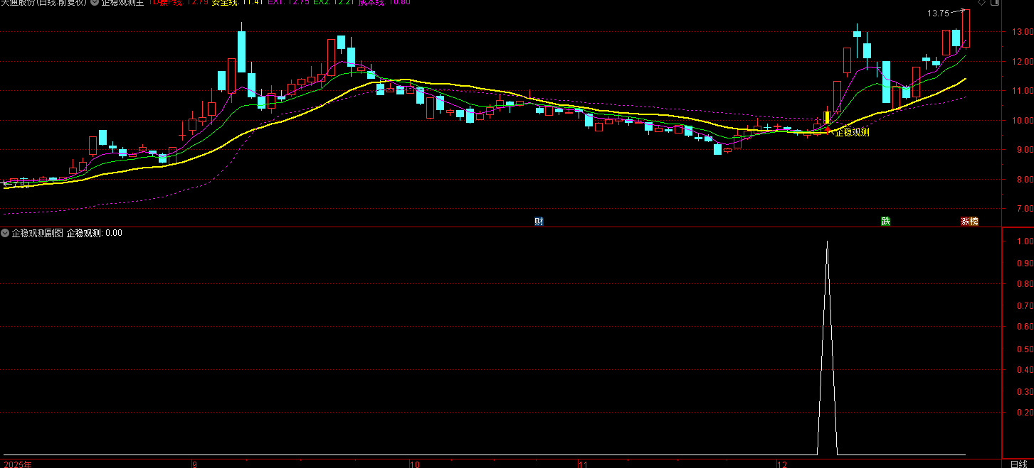 指标主要用于识别股价在长期低位后出现的潜在企稳反弹信号。通过多条均线和指数平均线判断趋势方向,结合成本分布计算出“成本线”作为关键支撑参考。当股价放量上穿成本线、处于相对低位、且满足短期均线上多排列等条件时,系统会标记买入观测点,并在K线上标注提示。