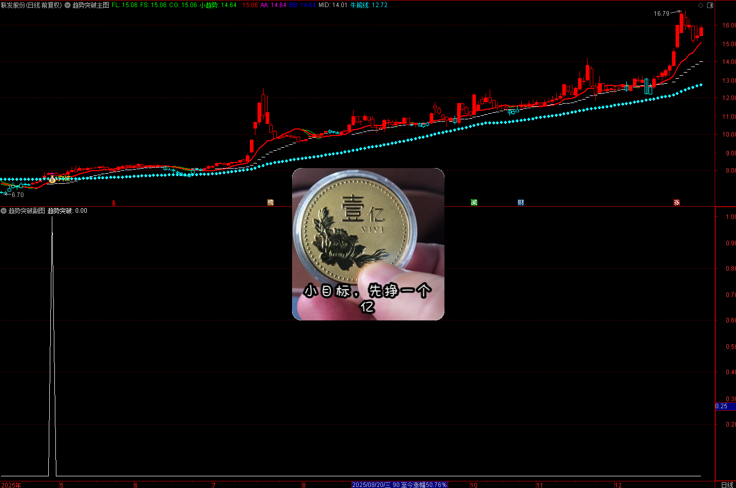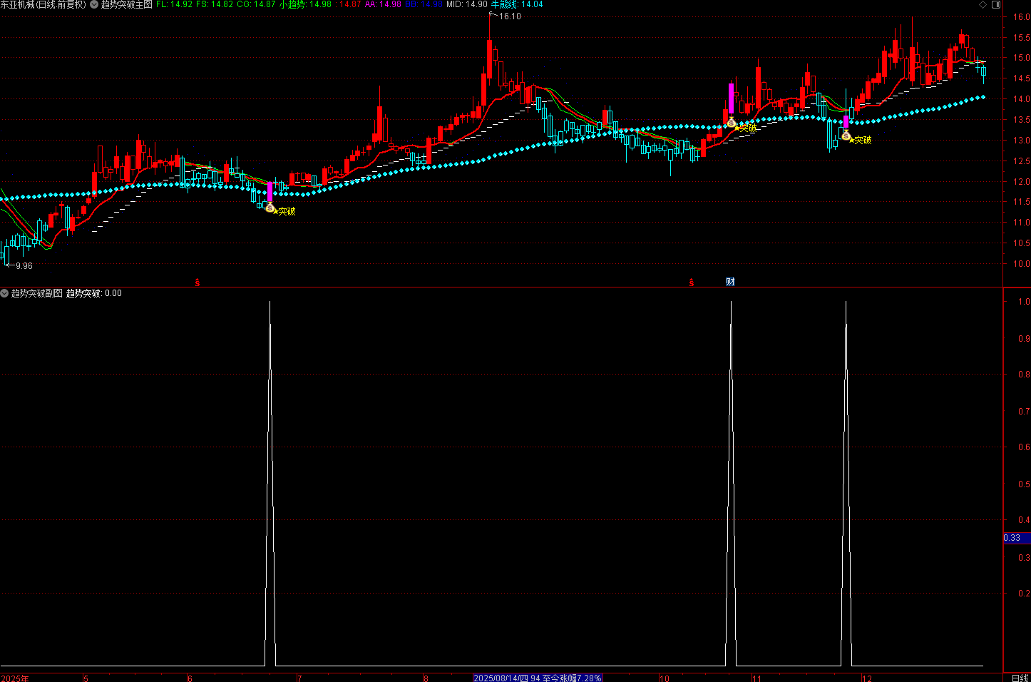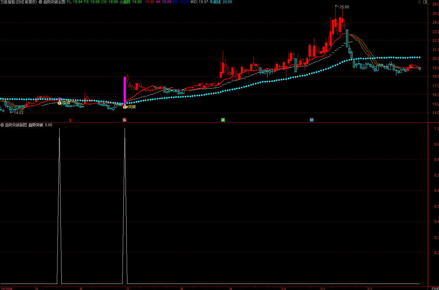 该公式构建了一个综合趋势跟踪系统,核心由13日均线(CG线)与60日半年线构成。当彩色CG线(红绿交替)上穿白色大趋势线且MACD指标同步走强时,系统在K线下方标记黄色"★突破"信号并显示紫色箭头。