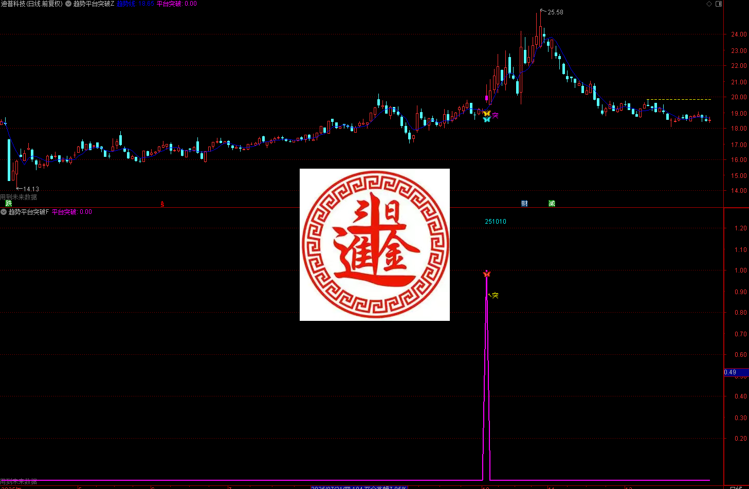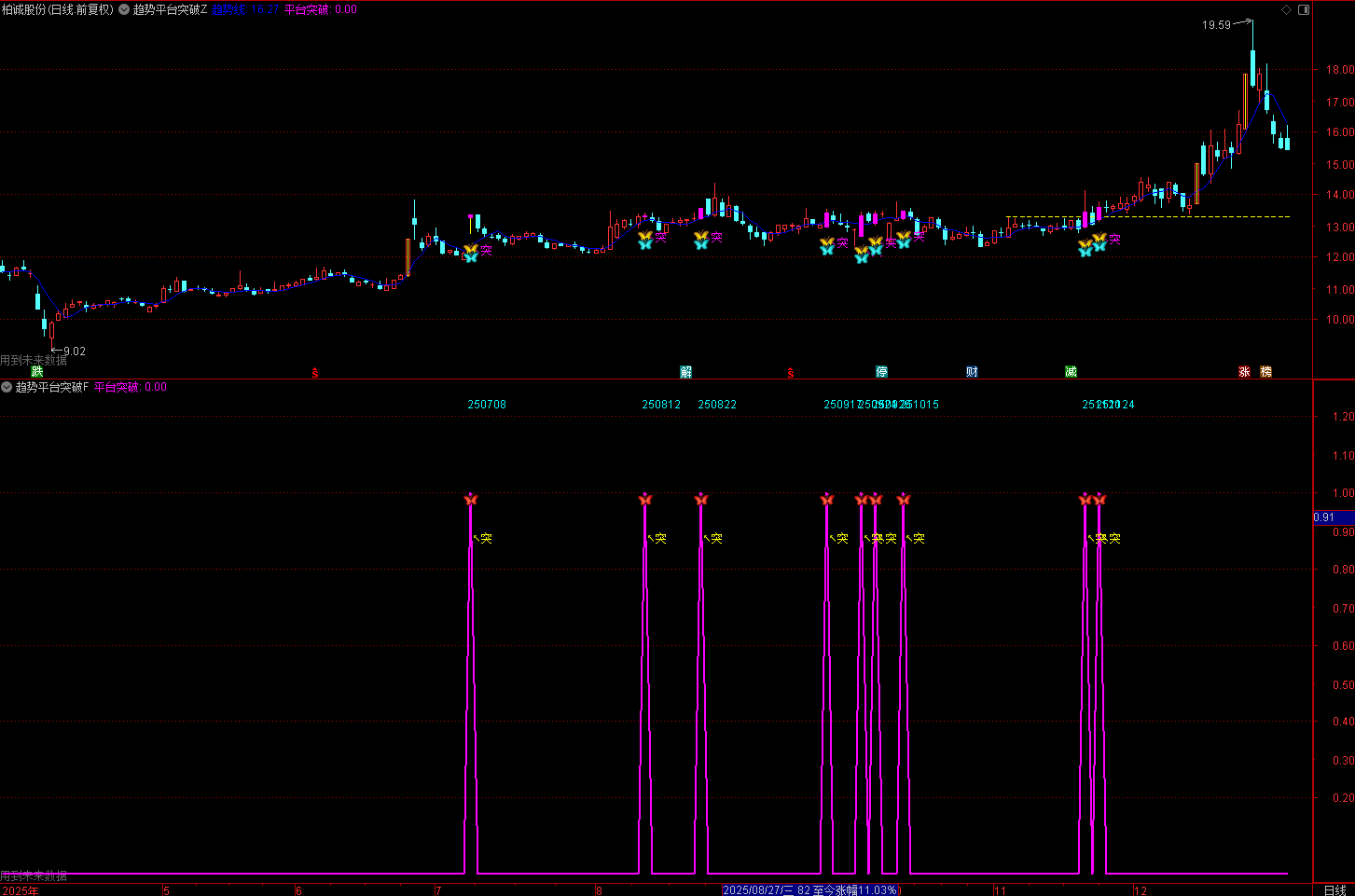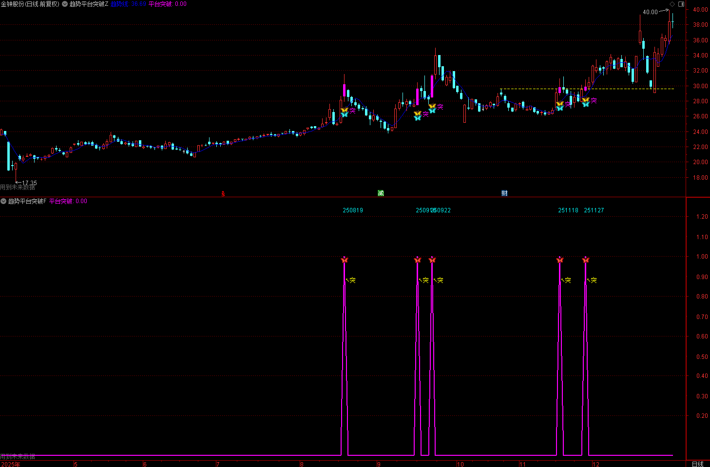 指标旨在识别价格对近期高点平台的突破行为。通过定位过去一段时间内的显著高点,绘制水平阻力线,当股价向上穿越该平台时,视为趋势转强信号,并以醒目标记提示突破位置。同时结合短期均线辅助判断走势方向,若伴随强势阳线或涨停,则增强信号有效性。操作上,投资者可在有效突破平台后考虑跟进,捕捉趋势启动初期的机会。