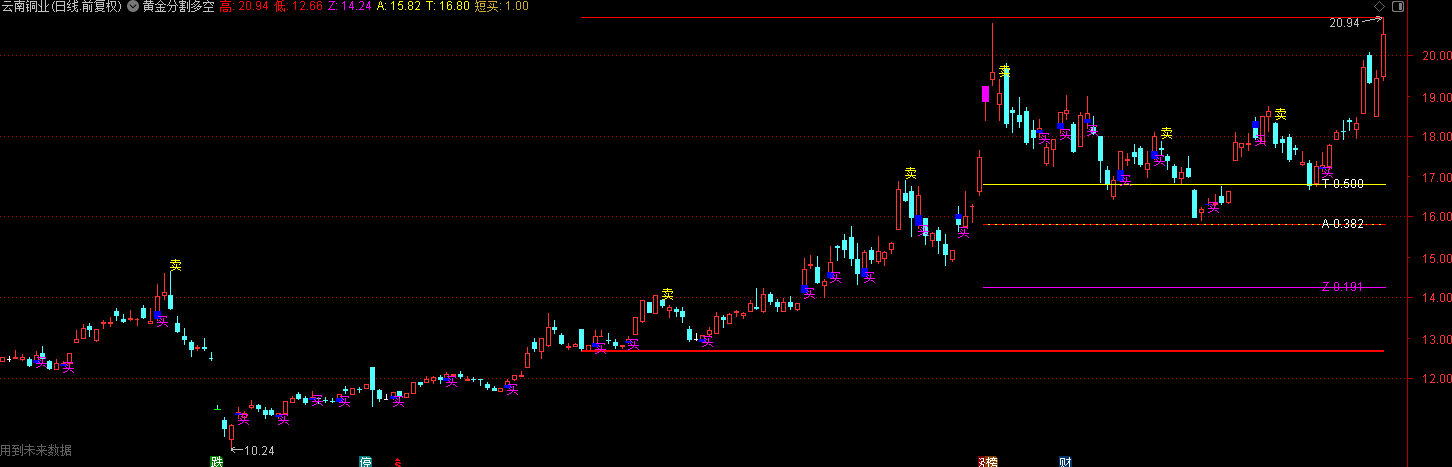 指标主要用于识别价格极端波动和潜在的反转机会。通过标记涨停与跌停K线,直观显示市场情绪;同时结合长期高低点构建斐波那契关键位,辅助判断支撑与压力区域。此外,利用ZIG之字转向函数捕捉不同周期的趋势拐点,并配合连续小K线组合识别短期底部,形成“短买”信号。整体策略偏重于在价格超跌或趋势转折时寻找入场点,高位则提示离场。