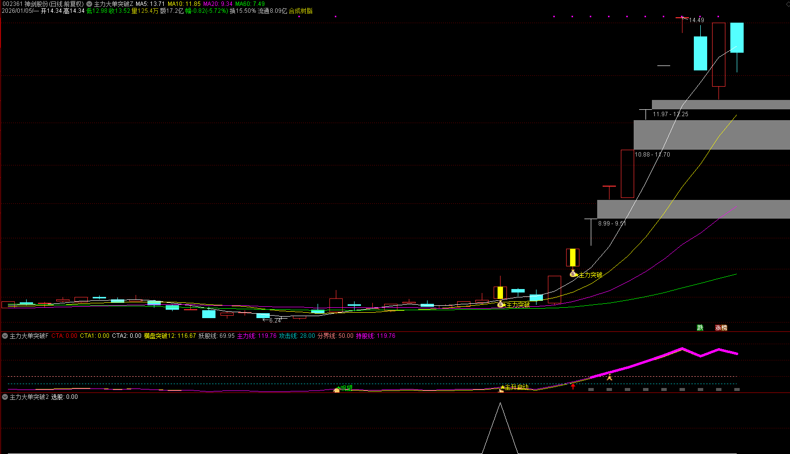 核心在于识别“横盘突破”。它结合均线多头排列与价格突破近期震荡区间,当条件满足时,K线会标记黄色柱状并显示“★主力突破”图标,直观提示买点。