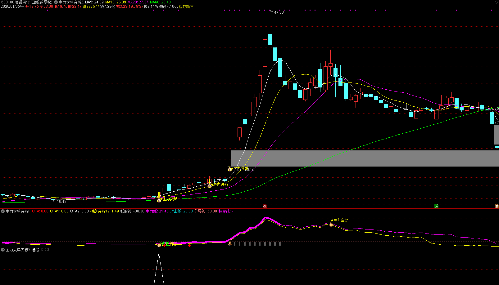 3. 风险控制:该系统为趋势跟踪工具,需结合市场环境使用。突破失败时,主图均线多头排列被破坏或副图股价跌破攻击线可作为止损参考。