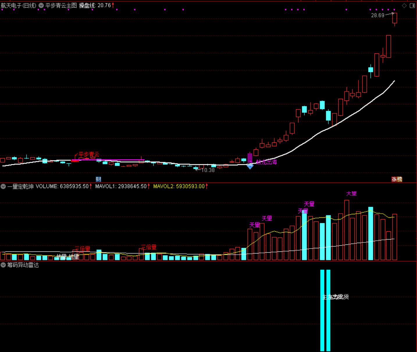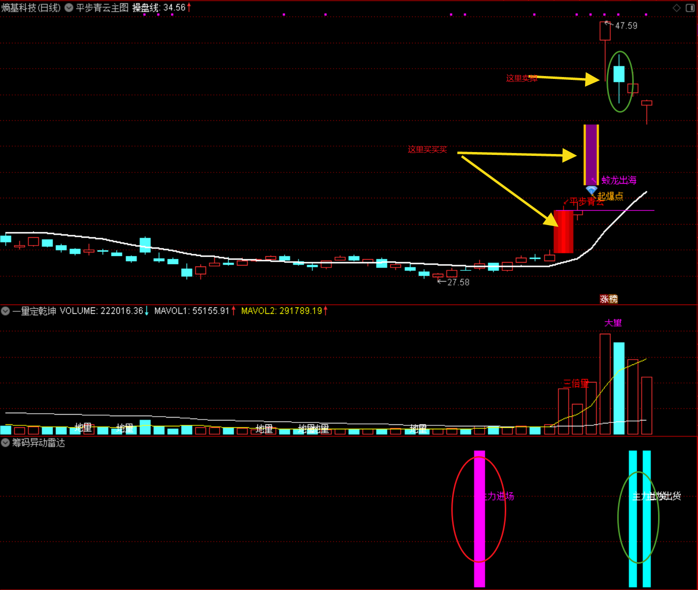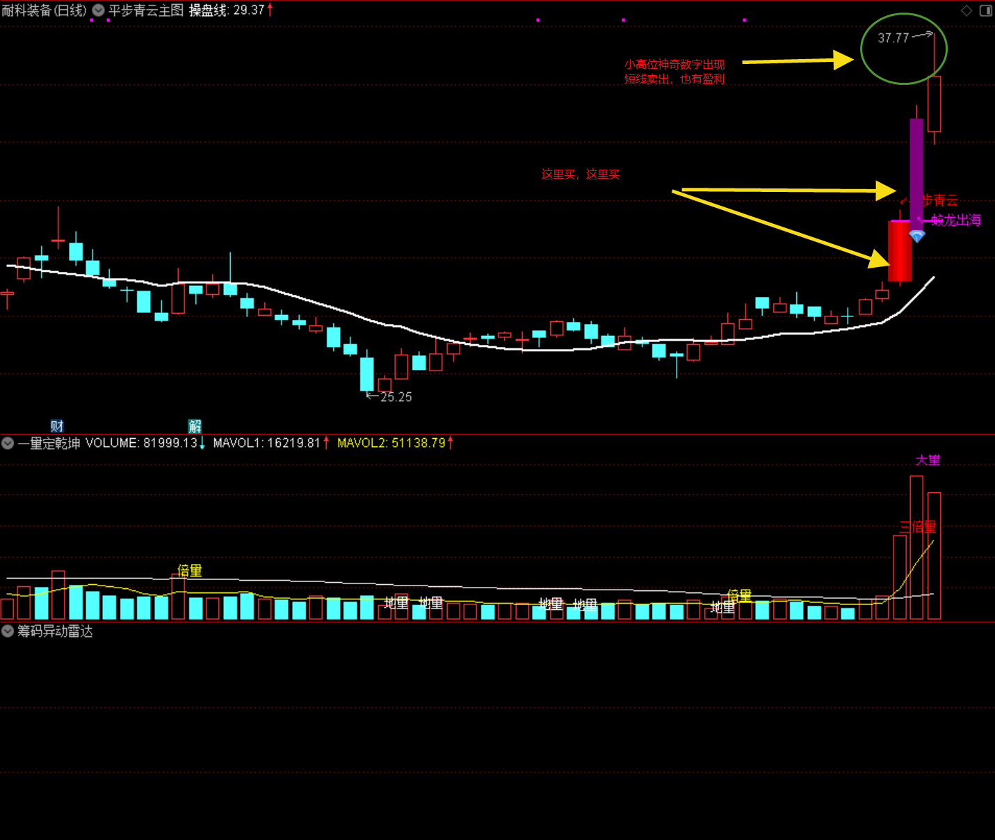 平步青云战法要点:1,今日成交量大于昨日成交量N倍以上【主力进场】;2,量能对应的K线必须是非涨停的阳线【主力试盘】;3,K线处于震荡突破最近五天,形成趋势【主力进攻】;