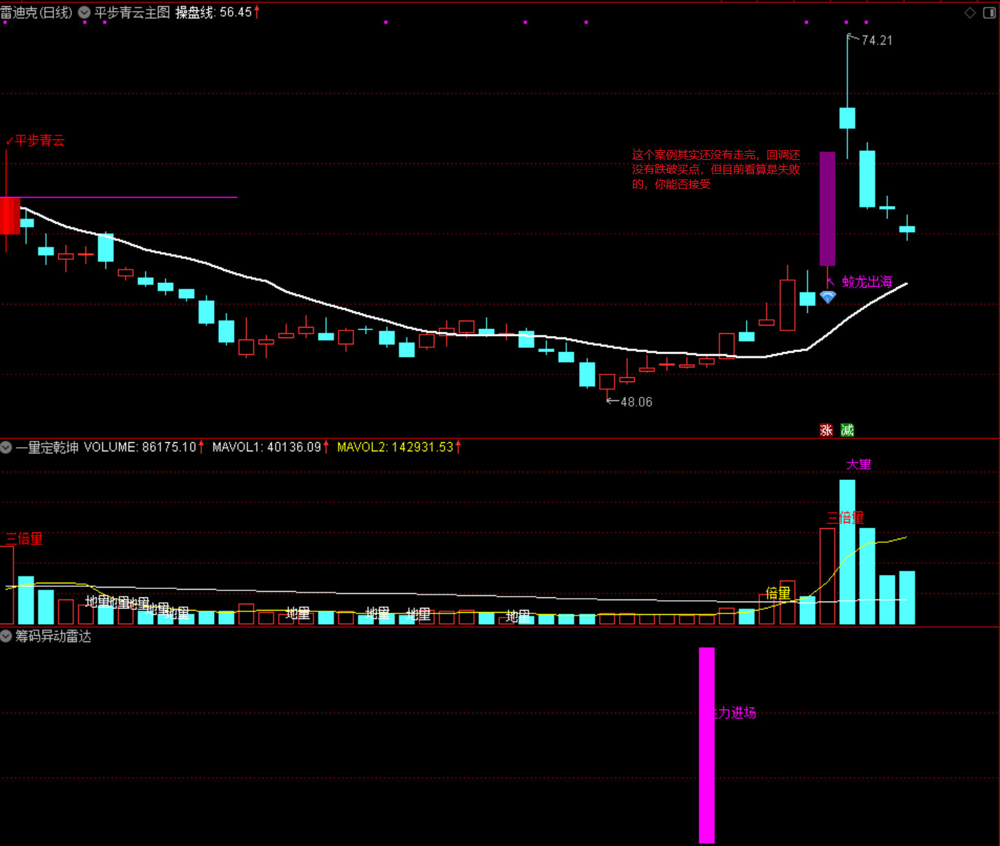 战法要点:1,当日量能是昨日成交量的N倍以上(微微放量);2,当日换手率大于5%;3,当日涨幅在5%以上;4,筹码获利比例大于某个数字【参考信号】;5,突破前方13个交易日高点买入;6,最好前面一段刚出现副图筹码异动雷达“主力进场”信号,或者一次及以上平步青云试盘信号。