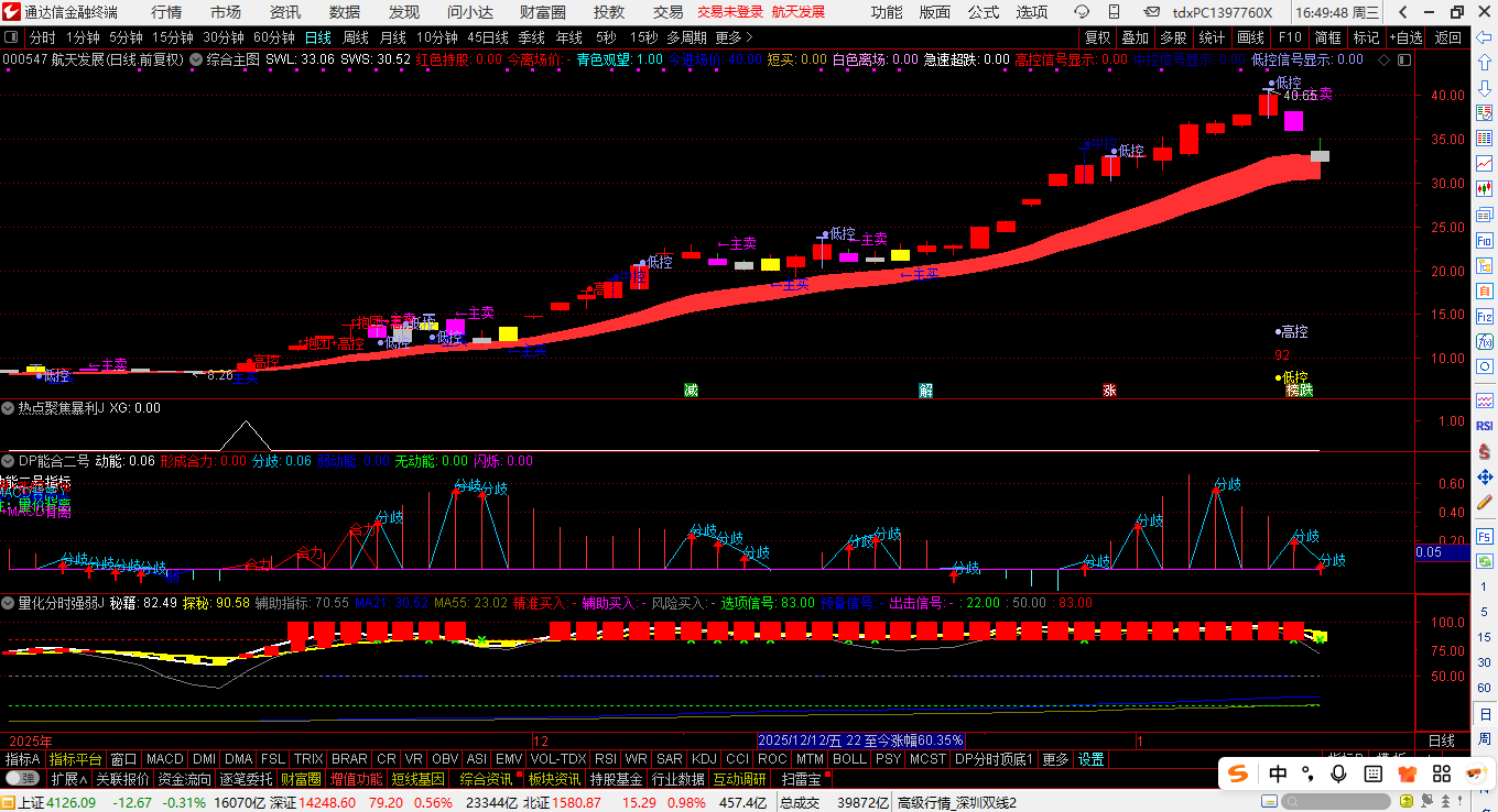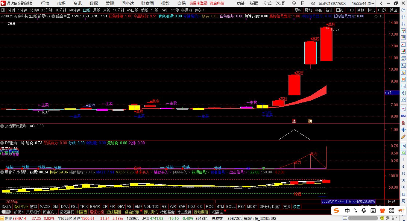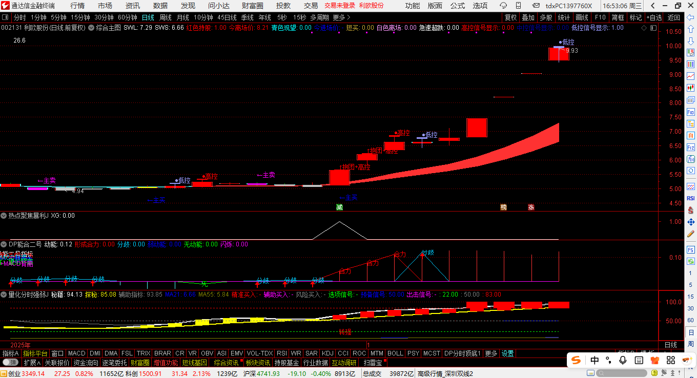 2.上车方式:触发信号当日低进入。(指标含有“量化分时强弱J”指标既可以用分时图辅助买入,也可以用于日K图)