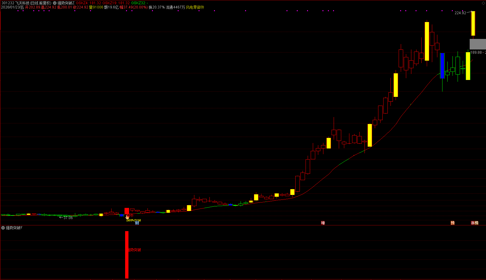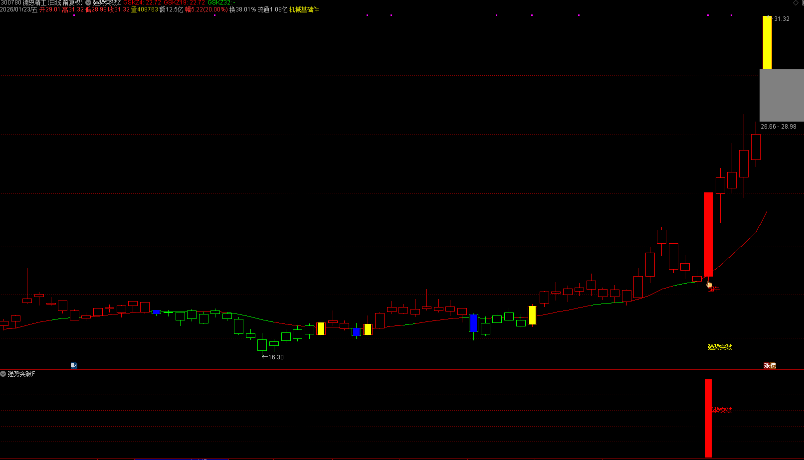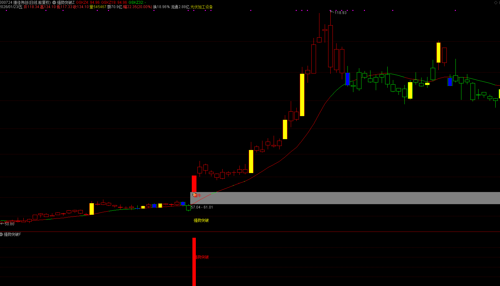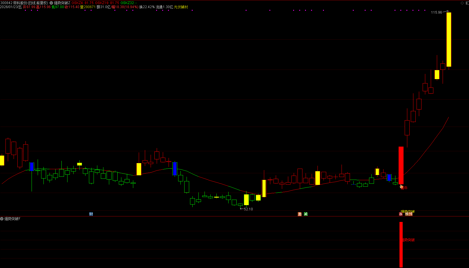 主图清晰呈现强势突破信号提示,趋势线在强势突破时转为红色,直观标识走势特征;