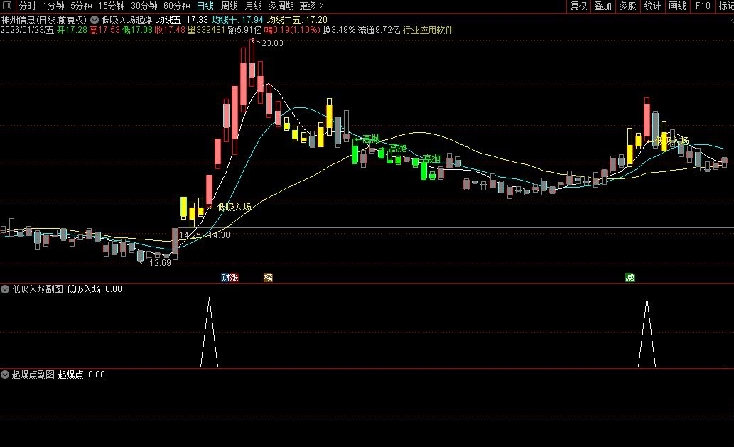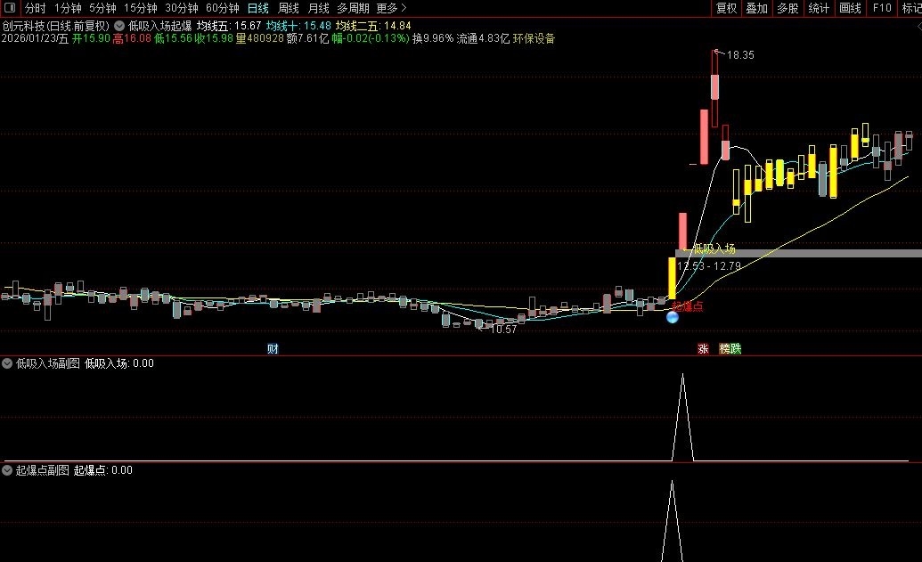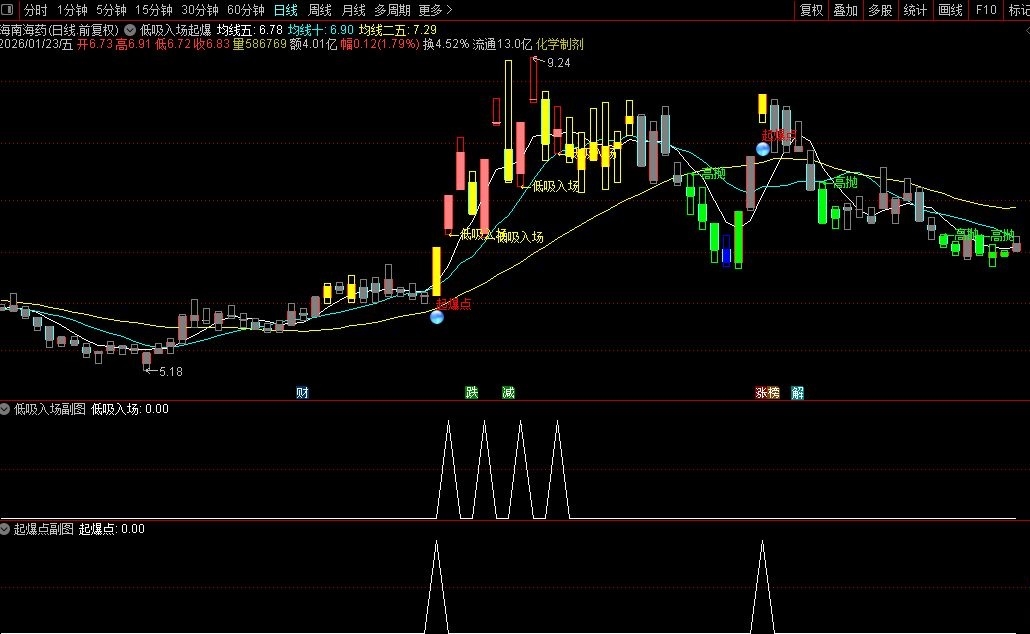 结合成交量、价格突破和短期动量信号,在特定条件组合下提示“低吸入场”“高抛”或“主力拉升”等操作时机。另设“起爆点”信号,用于捕捉放量突破关键压力位且接近涨停的强势启动行情。