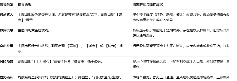 核心用于识别股票的抄底机会、卖出信号、多周期共振的强势上涨(妖股)信号。