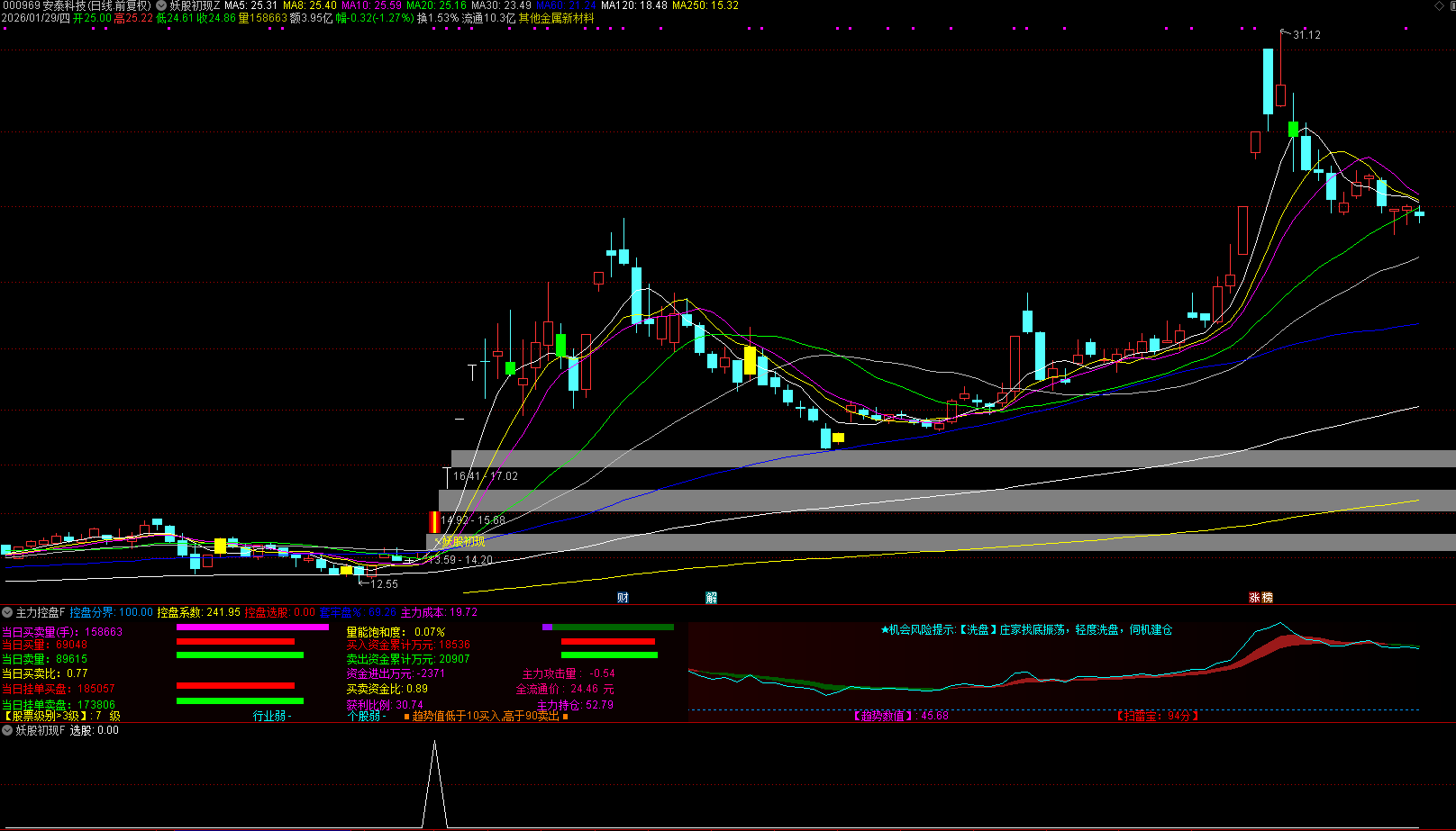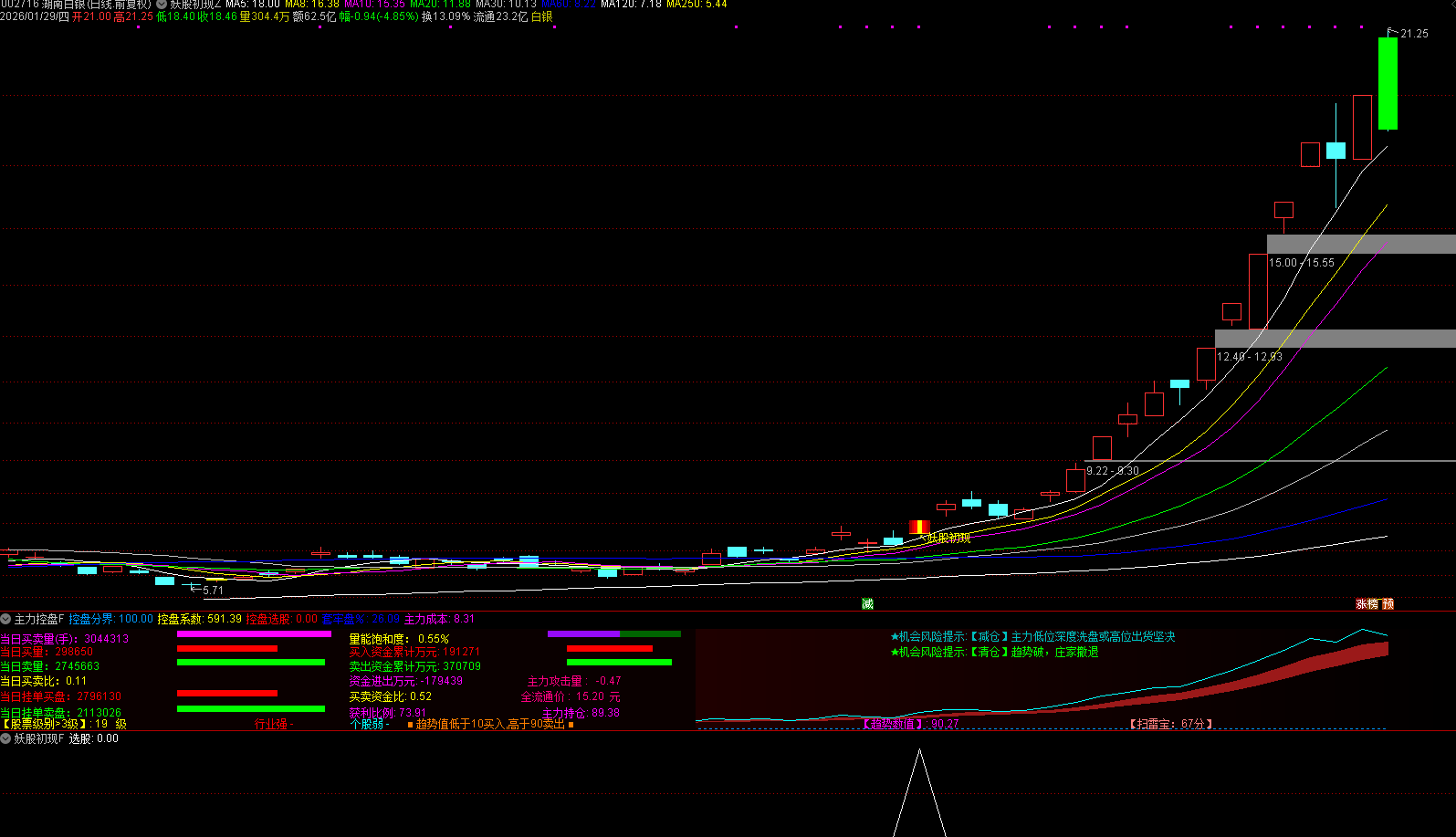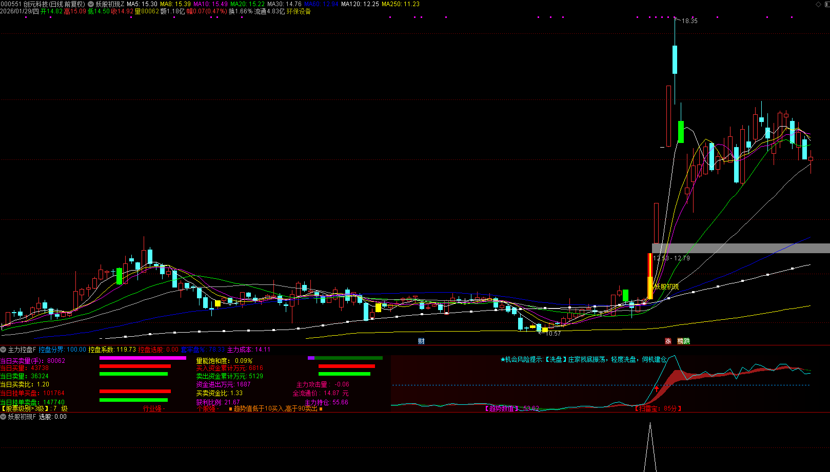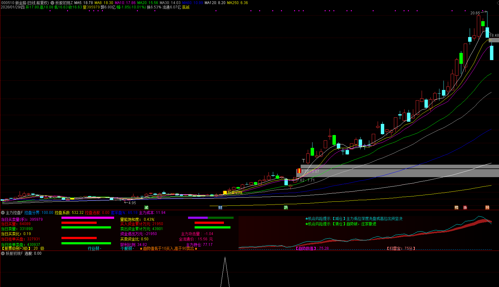 控盘系数:衡量股价相对于历史最低价的涨幅,突破100分界线时标记红色信号,表示主力可能开始控盘。
