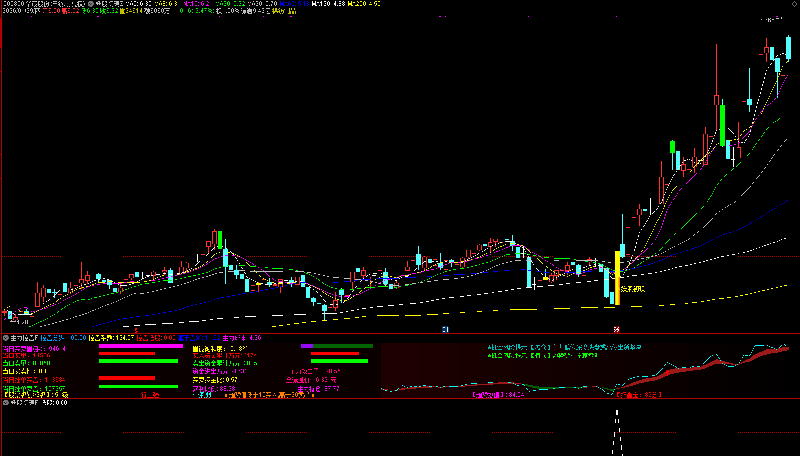 机会风险提示:根据K线和成交量形态,自动判断并文字提示当前主力可能的行为阶段,如 【洗盘】、【建仓】、【高抛】、【减仓】、【清仓】 等,并特别警示 【主力黑心】 风险。