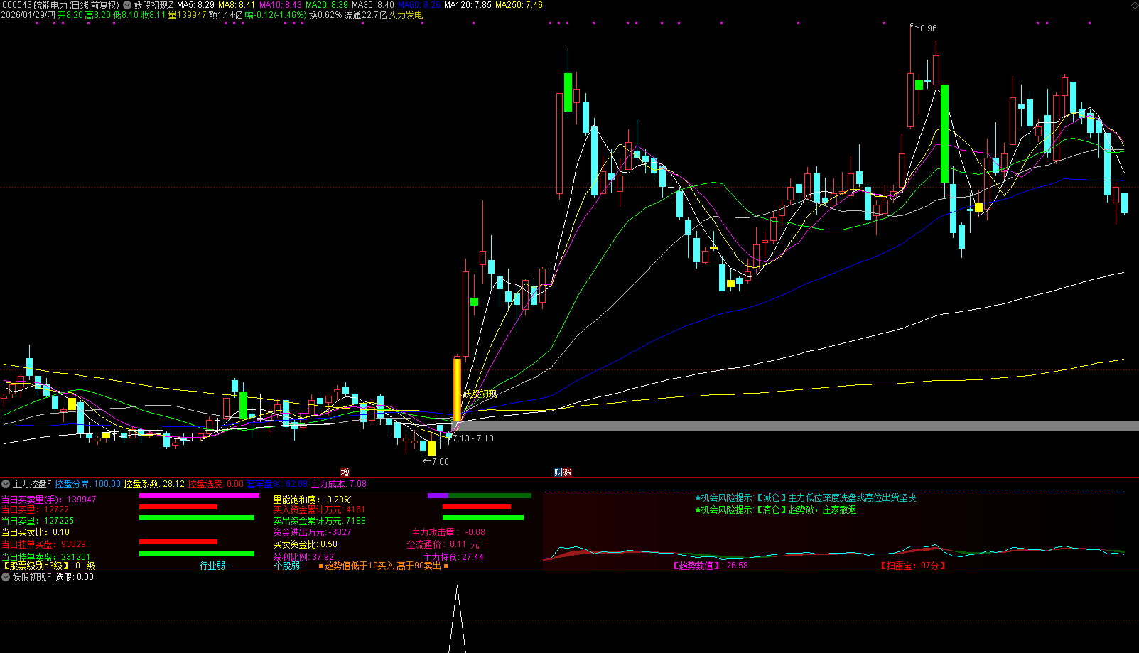 数据面板:在副图右侧集中显示关键数据,如成交量、买卖量、资金流向、量能饱和度、获利比例、主力持仓、全流通价、主力攻击量等。
