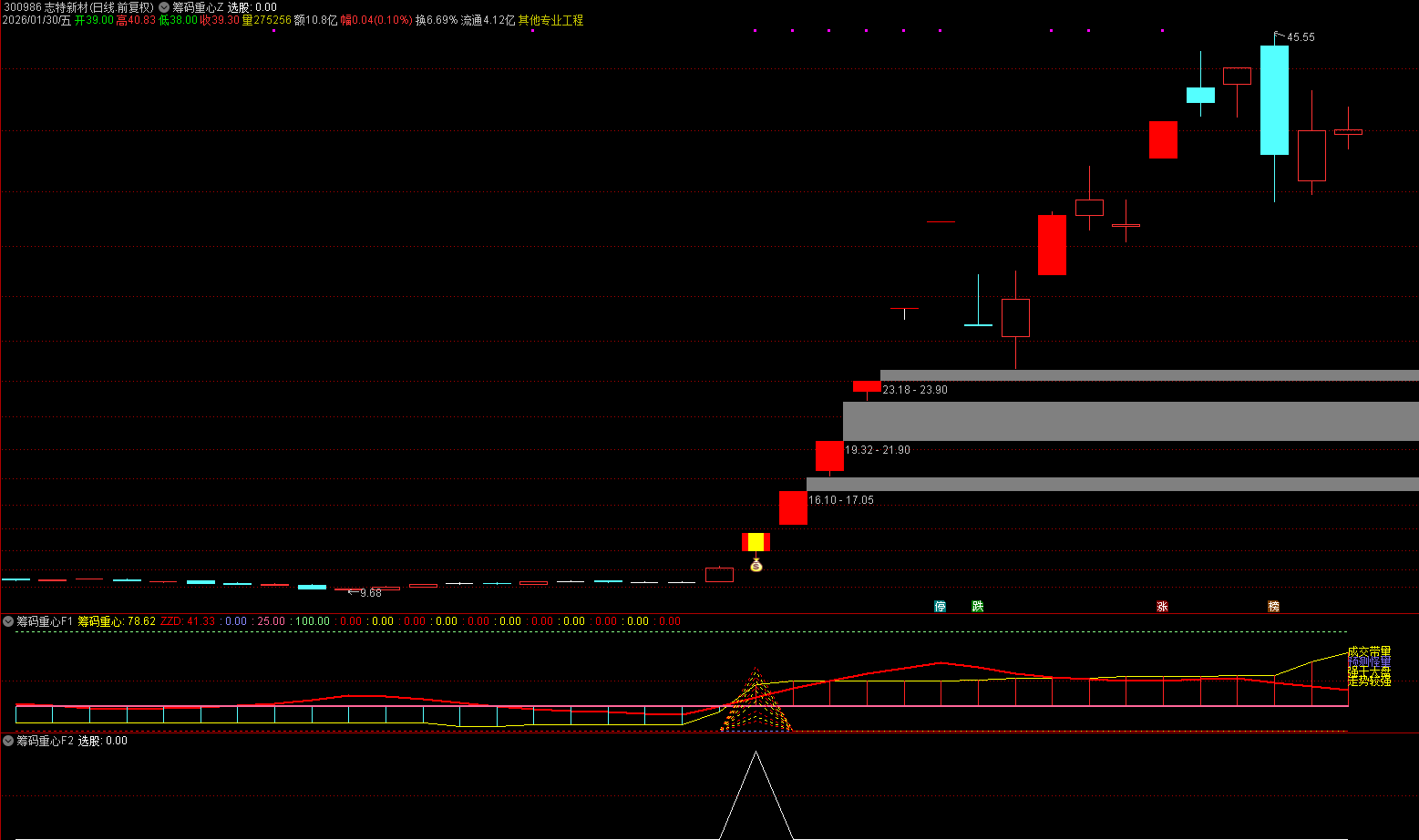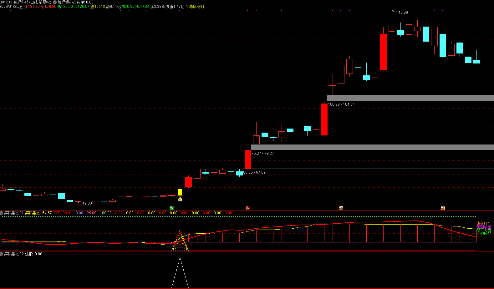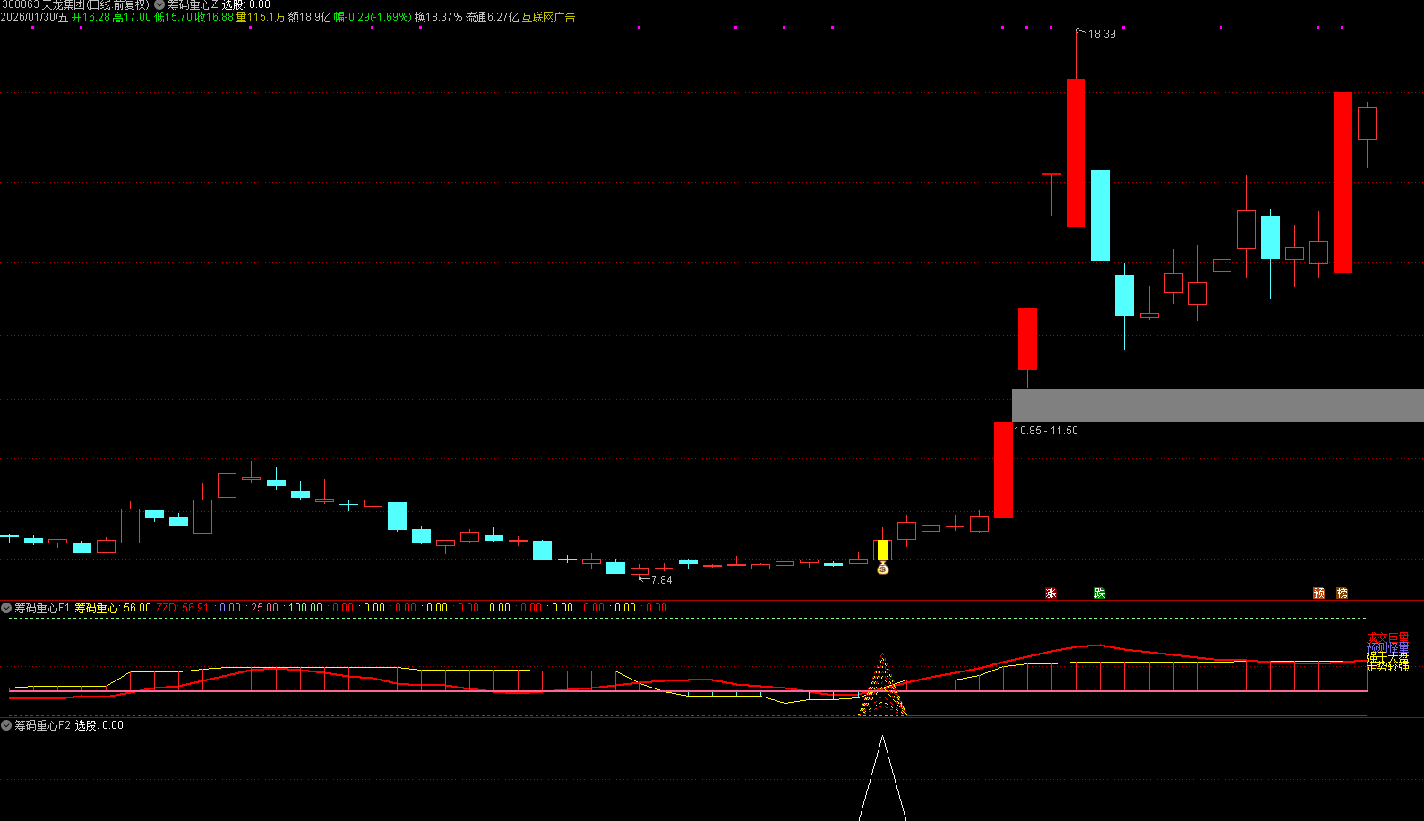 筹码重心指标是一款多维度的个股综合研判工具,专为日线级别趋势分析设计。该指标深度融合筹码分布、动向指标、量能分级以及个股与大盘相对强弱四大核心维度,不仅实时呈现个股的量能特征与筹码位置,更通过“筹码加动向”双突破机制,精准识别关键趋势启动信号。当筹码重心与多空分歧度同步向上突破时,往往预示着强势上涨行情的开启。