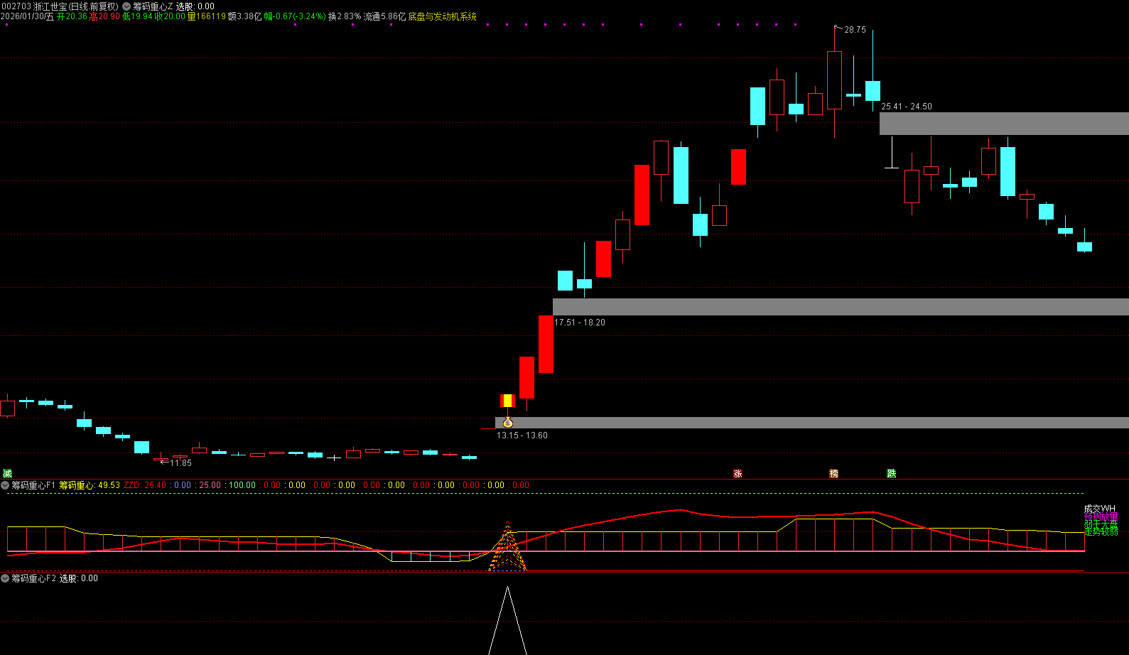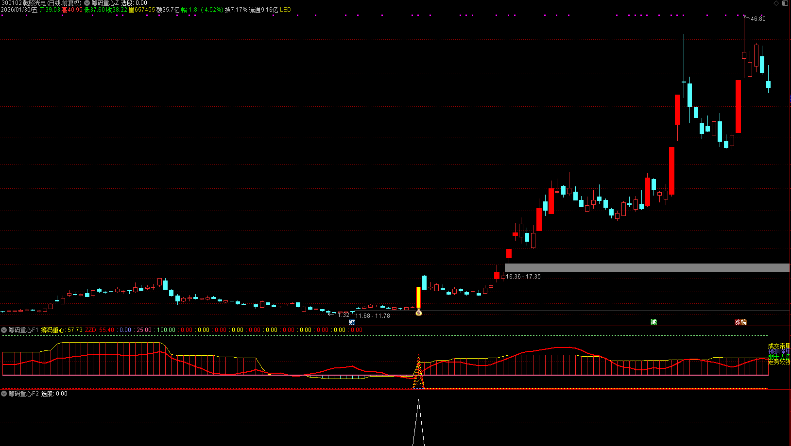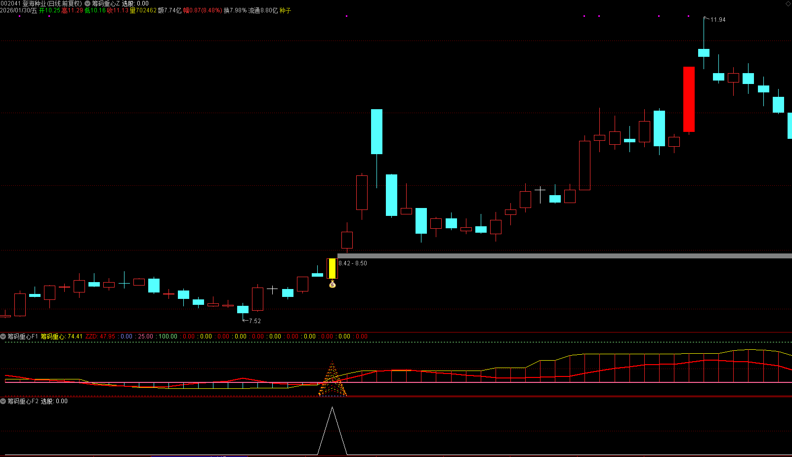 筹码重心指标是一款多维度的个股综合研判工具,专为日线级别趋势分析设计。该指标深度融合筹码分布、动向指标、量能分级以及个股与大盘相对强弱四大核心维度,不仅实时呈现个股的量能特征与筹码位置,更通过“筹码加动向”双突破机制,精准识别关键趋势启动信号。当筹码重心与多空分歧度同步向上突破时,往往预示着强势上涨行情的开启。