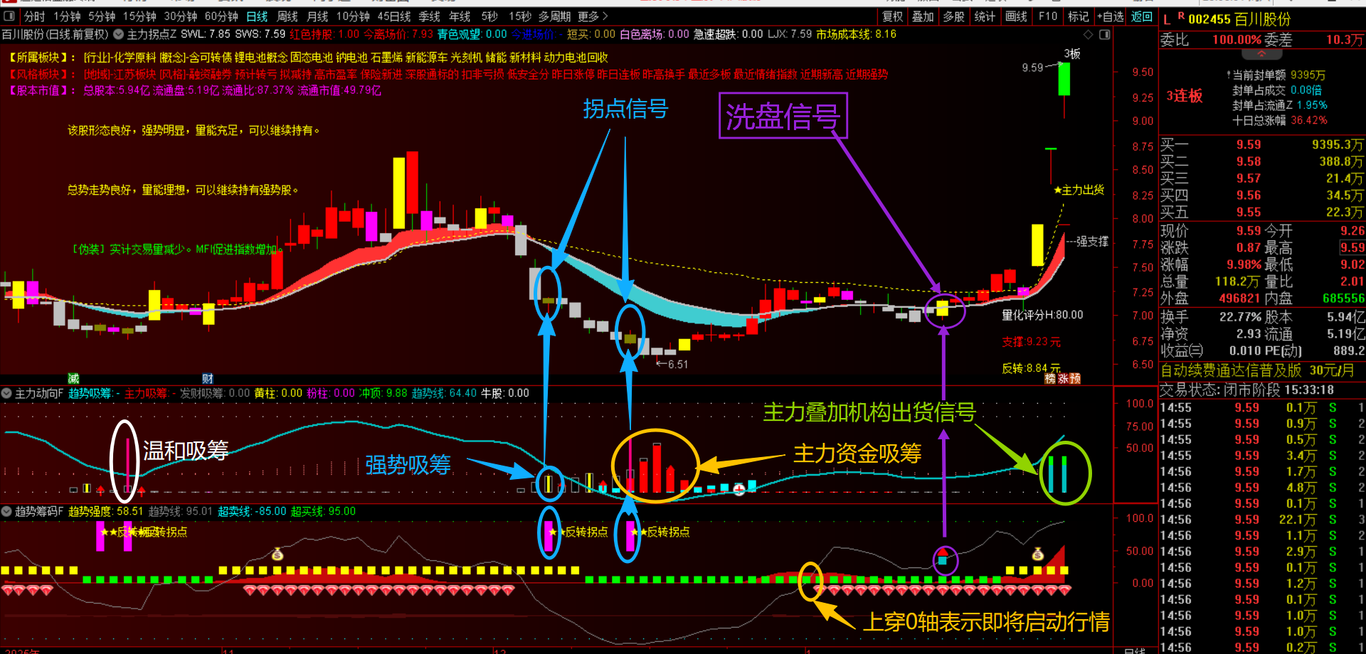 2. 副图公式观察“控盘启动”突破100及“极致反转”紫色柱,配合黄色能量柱放大确认;