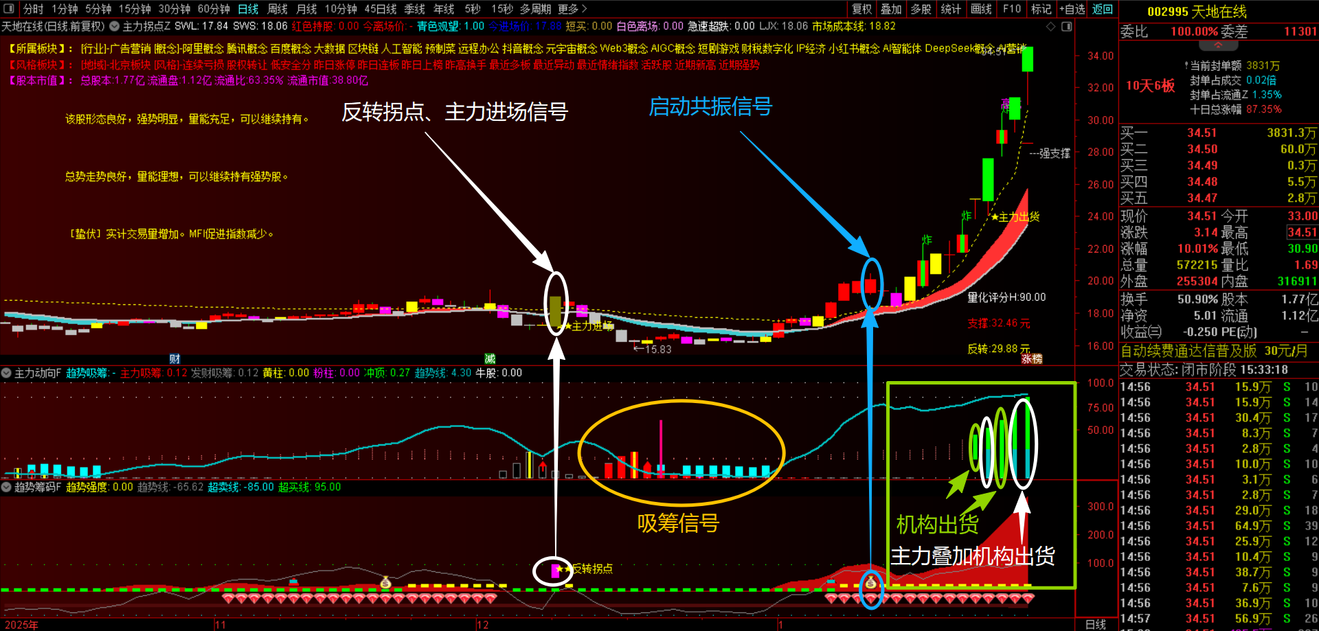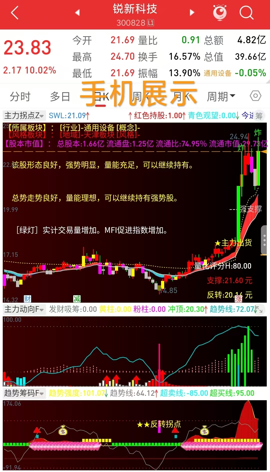 “主力拐点主图”融合K线、板块信息、业绩数据、支撑阻力、连板识别及多维趋势判断,实时标注持股/观望信号。