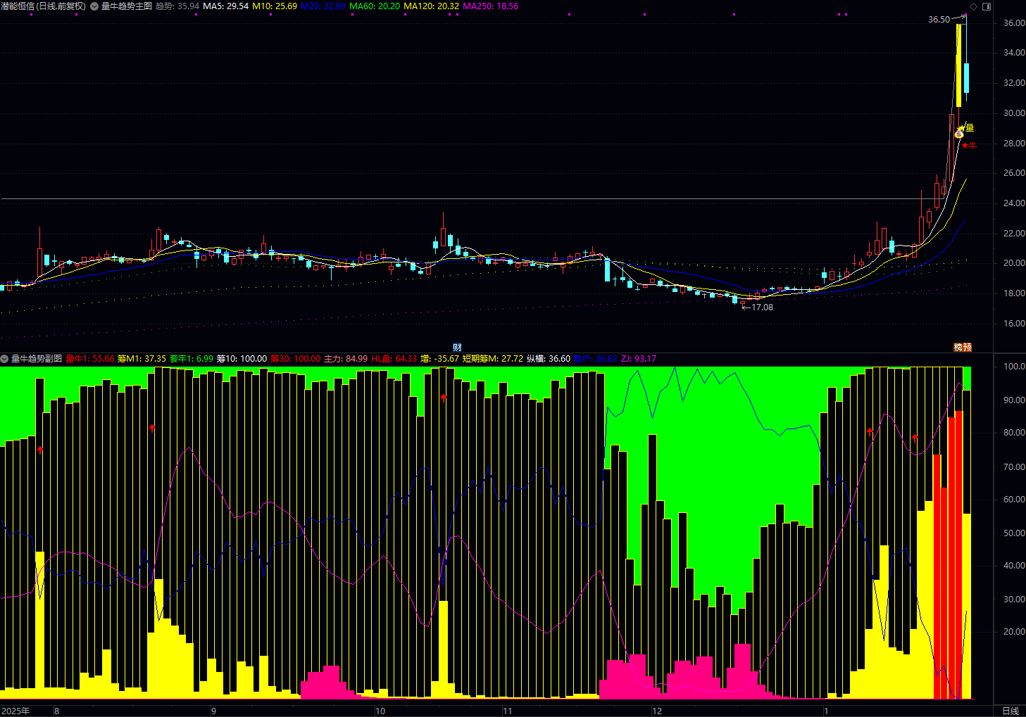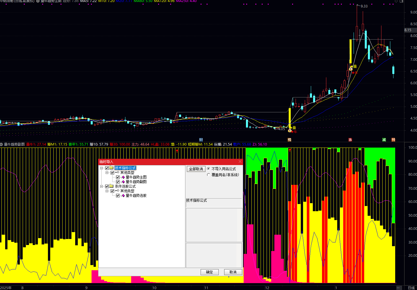 【量牛趋势】是一套含主图、双副图及选股功能的分析工具,助力多维度观察行情变化。主图自带趋势画线,强势阶段标注牛信号与量提示信号,直观呈现趋势走向。量牛筹码副图以红黄柱提示量能筹码状态,高位显示绿柱提示位置特征。另一副图聚焦量信号,与筹码副图红柱信号对应,辅助量能关联分析。