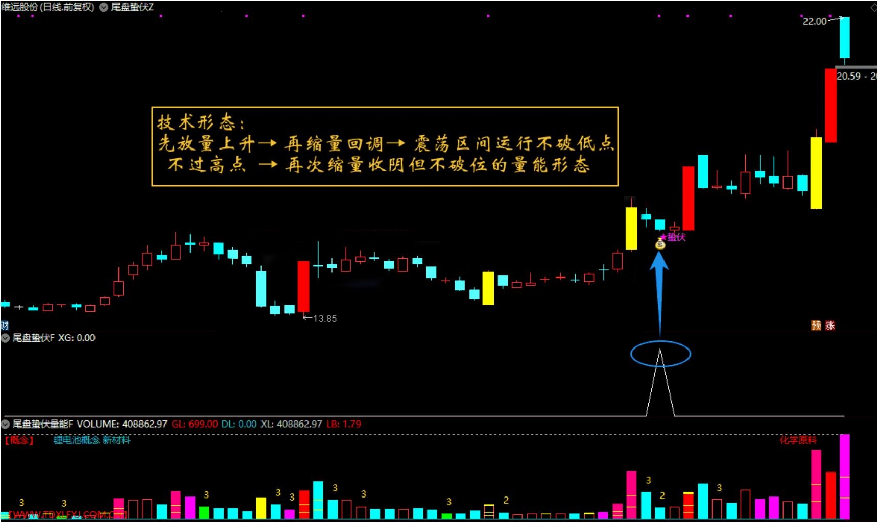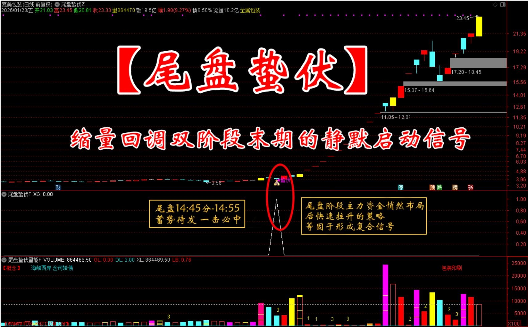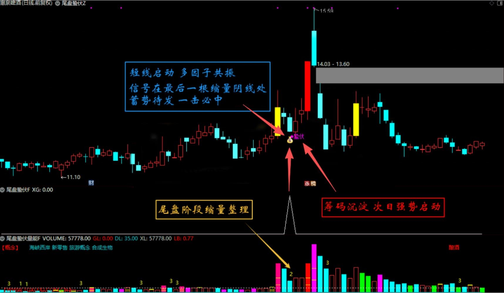 中短线启动、多因子共振,尾盘阶段缩量整理、筹码沉淀、次日强势启动,信号在最后一根缩量阴线处,”蓄势待发,一击必中”。
