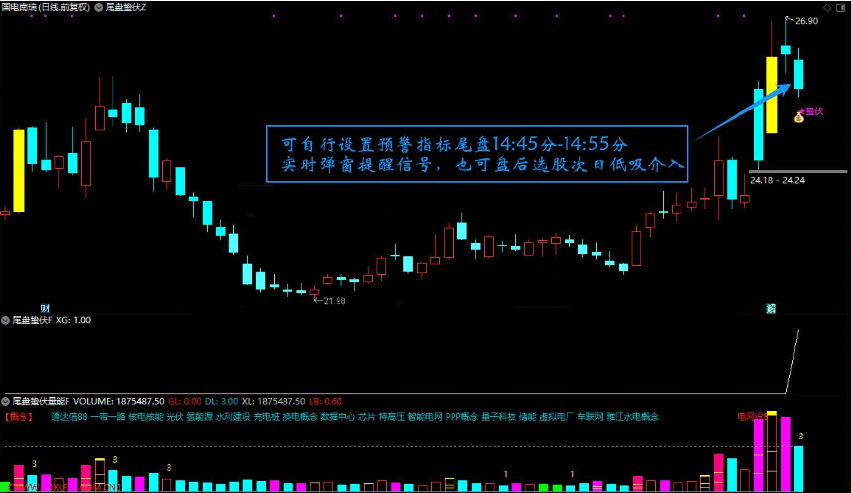 在每天尾盘14:45分-14:55运行,筛选满足条件的标的,捕捉即将启动的强势标的,低吸良机,尾盘阶段主力资金悄然布局后快速拉升的策略,等因子形成复合信号,可自行设置预警指标尾盘14:45分-14:55分,实时弹窗提醒信号,也可盘后选股次日低吸介入。