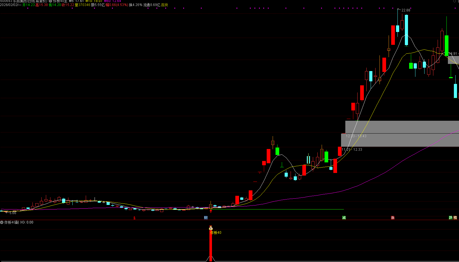 关键信号:涨停出现之后,开始回调震荡,期间不再有涨停,当前出现炸板K线(即盘中触及涨停但收盘未封住),视为洗盘结束、试盘启动的信号,这是炸板40的思路.